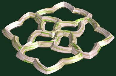 Keywords: mathematica 3d cg parametricplot3d texture torus code program algorithm プログラム コード アルゴリズム 輪環 りんかん ドーナツ どーなつ 五芒星 ごぼうせい geometric sculpture geometricsculpture shape geometry sculpture mapping テクスチャ マッピング 模様 もよう abstract 抽象 ちゅうしょう アブストラクト design pattern デザイン パターン graphic グラフィック グラフィクス structure 意匠 構造 symmetry 対称性 たいしょうせい シンメトリー 対称 たいしょう black background indoor a = 6; (* center hole size *) b = 5; (* penta-torus *) c = 4; (* distance from the center of rotation *) d = 4; (* number of torus *) h = 0; (* height of a torus *) SetOptions[ParametricPlot3D, PlotRange -> Full, Mesh -> None, Boxed -> False, Axes -> False, PlotPoints -> 400, ImageSize -> 3000, Background -> RGBColor[{20, 50, 30}/255], PlotStyle -> Directive[Specularity[White, 70], Texture[Import["D:/tmp/862.jpg"]]], TextureCoordinateFunction -> ({#4 + #5, #5 / Pi} &), Lighting -> "Neutral"]; f[v_] := TriangleWave[{-1, 1}, v/(2 Pi)]; g[v_] := TriangleWave[{-1, 1}, v/(2 Pi) + 1/4]; x = (a - g[t] - f[b s]) Cos[s] + c; y = (a - g[t] - f[b s]) Sin[s] + c; z = (a - f[t] - h f[b s]); rm = Table[{x, y, z}.RotationMatrix[2 i Pi/d, {0, 0, 1}], {i, d}]; ParametricPlot3D[rm, {t, 0, 2 Pi}, {s, 0, Pi}] (*--- The Texture *) a = 6; (* center hole size *) b = 5; (* penta-torus *) c = 4; (* distance from the center of rotation *) d = 4; (* number of torus *) h = 0; (* height of a torus *) SetOptions[ParametricPlot3D, PlotRange -> Full, Mesh -> None, Boxed -> False, Axes -> False, PlotPoints -> 400, ImageSize -> 3000, Background -> RGBColor[{20, 50, 30}/255], PlotStyle -> Directive[Specularity[White, 70], Texture[Import["D:/tmp/862.jpg"]]], TextureCoordinateFunction -> ({#4 + #5, #5 / Pi} &), Lighting -> "Neutral"]; f[v_] := TriangleWave[{-1, 1}, v/(2 Pi)]; g[v_] := TriangleWave[{-1, 1}, v/(2 Pi) + 1/4]; x = (a - g[t] - f[b s]) Cos[s] + c; y = (a - g[t] - f[b s]) Sin[s] + c; z = (a - f[t] - h f[b s]); rm = Table[{x, y, z}.RotationMatrix[2 i Pi/d, {0, 0, 1}], {i, d}]; ParametricPlot3D[rm, {t, 0, 2 Pi}, {s, 0, Pi}] (*--- The Texture *) |