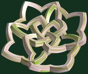 Keywords: mathematica 3d cg parametricplot3d texture torus code program algorithm プログラム コード アルゴリズム 輪環 りんかん ドーナツ どーなつ 五芒星 ごぼうせい geometric sculpture geometricsculpture shape geometry sculpture mapping テクスチャ マッピング 模様 もよう abstract 抽象 ちゅうしょう アブストラクト design pattern デザイン パターン graphic グラフィック グラフィクス structure 意匠 構造 symmetry 対称性 たいしょうせい シンメトリー 対称 たいしょう black background tangle a = 6; (* center hole size *) b = 5; (* penta-torus *) c = 3; (* distance from the center of rotation *) d = 4; (* number of torus *) h = 1; (* height of a torus *) SetOptions[ParametricPlot3D, PlotRange -> Full, Mesh -> None, Boxed -> False, Axes -> False, PlotPoints -> 400, ImageSize -> 3000, Background -> RGBColor[{20, 50, 30}/255], PlotStyle -> Directive[Specularity[White, 70], Texture[Import["D:/tmp/862.jpg"]]], TextureCoordinateFunction -> ({#4 + #5, #5 / Pi} &), Lighting -> "Neutral"]; f[v_] := TriangleWave[{-1, 1}, v/(2 Pi)]; g[v_] := TriangleWave[{-1, 1}, v/(2 Pi) + 1/4]; x = (a - g[t] - f[b s]) Cos[s] + c; y = (a - g[t] - f[b s]) Sin[s] + c; z = (a - f[t] - h f[b s]); rm = Table[{x, y, z}.RotationMatrix[2 i Pi/d, {0, 0, 1}], {i, d}]; ParametricPlot3D[rm, {t, 0, 2 Pi}, {s, 0, Pi}] (*--- The Texture *) a = 6; (* center hole size *) b = 5; (* penta-torus *) c = 3; (* distance from the center of rotation *) d = 4; (* number of torus *) h = 1; (* height of a torus *) SetOptions[ParametricPlot3D, PlotRange -> Full, Mesh -> None, Boxed -> False, Axes -> False, PlotPoints -> 400, ImageSize -> 3000, Background -> RGBColor[{20, 50, 30}/255], PlotStyle -> Directive[Specularity[White, 70], Texture[Import["D:/tmp/862.jpg"]]], TextureCoordinateFunction -> ({#4 + #5, #5 / Pi} &), Lighting -> "Neutral"]; f[v_] := TriangleWave[{-1, 1}, v/(2 Pi)]; g[v_] := TriangleWave[{-1, 1}, v/(2 Pi) + 1/4]; x = (a - g[t] - f[b s]) Cos[s] + c; y = (a - g[t] - f[b s]) Sin[s] + c; z = (a - f[t] - h f[b s]); rm = Table[{x, y, z}.RotationMatrix[2 i Pi/d, {0, 0, 1}], {i, d}]; ParametricPlot3D[rm, {t, 0, 2 Pi}, {s, 0, Pi}] (*--- The Texture *) |