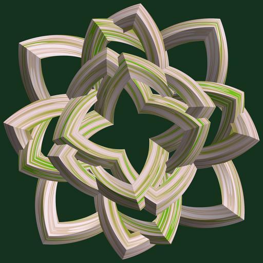 Keywords: mathematica 3d cg parametricplot3d texture torus code program algorithm プログラム コード アルゴリズム 輪環 りんかん ドーナツ どーなつ 五芒星 ごぼうせい geometric sculpture geometricsculpture shape geometry sculpture mapping テクスチャ マッピング 模様 もよう abstract 抽象 ちゅうしょう アブストラクト design pattern デザイン パターン graphic グラフィック グラフィクス structure 意匠 構造 symmetry 対称性 たいしょうせい シンメトリー 対称 たいしょう tangle black background indoor a = 6; (* center hole size *) b = 5; (* penta-torus *) c = 1.8; (* distance from the center of rotation *) d = 4; (* number of torus *) h = 2; (* height of a torus *) SetOptions[ParametricPlot3D, PlotRange -> Full, Mesh -> None, Boxed -> False, Axes -> False, PlotPoints -> 400, ImageSize -> 3000, Background -> RGBColor[{20, 50, 30}/255], PlotStyle -> Directive[Specularity[White, 70], Texture[Import["D:/tmp/862.jpg"]]], TextureCoordinateFunction -> ({#4 + #5, #5 / Pi} &), Lighting -> "Neutral"]; f[v_] := TriangleWave[{-1, 1}, v/(2 Pi)]; g[v_] := TriangleWave[{-1, 1}, v/(2 Pi) + 1/4]; x = (a - g[t] - f[b s]) Cos[s] + c; y = (a - g[t] - f[b s]) Sin[s] + c; z = (a - f[t] - h f[b s]); rm = Table[{x, y, z}.RotationMatrix[2 i Pi/d, {0, 0, 1}], {i, d}]; ParametricPlot3D[rm, {t, 0, 2 Pi}, {s, 0, Pi}] (*--- The Texture *) a = 6; (* center hole size *) b = 5; (* penta-torus *) c = 1.8; (* distance from the center of rotation *) d = 4; (* number of torus *) h = 2; (* height of a torus *) SetOptions[ParametricPlot3D, PlotRange -> Full, Mesh -> None, Boxed -> False, Axes -> False, PlotPoints -> 400, ImageSize -> 3000, Background -> RGBColor[{20, 50, 30}/255], PlotStyle -> Directive[Specularity[White, 70], Texture[Import["D:/tmp/862.jpg"]]], TextureCoordinateFunction -> ({#4 + #5, #5 / Pi} &), Lighting -> "Neutral"]; f[v_] := TriangleWave[{-1, 1}, v/(2 Pi)]; g[v_] := TriangleWave[{-1, 1}, v/(2 Pi) + 1/4]; x = (a - g[t] - f[b s]) Cos[s] + c; y = (a - g[t] - f[b s]) Sin[s] + c; z = (a - f[t] - h f[b s]); rm = Table[{x, y, z}.RotationMatrix[2 i Pi/d, {0, 0, 1}], {i, d}]; ParametricPlot3D[rm, {t, 0, 2 Pi}, {s, 0, Pi}] (*--- The Texture *) |