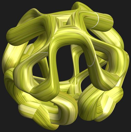 | Keywords: mathematica 3d cg parametricplot3d texture torus 輪環 りんかん ドーナツ どーなつ 四芒星 しぼうせい 四光星 しこうせい 四稜星 しりょうせい code program algorithm コード プログラム アルゴリズム bamboo 竹 たけ タケ geometric sculpture geometricsculpture shape geometry sculpture mapping テクスチャ マッピング 模様 もよう abstract 抽象 ちゅうしょう アブストラクト design pattern デザイン パターン graphic グラフィック グラフィクス structure 意匠 構造 symmetry 対称性 たいしょうせい シンメトリー 対称 たいしょう algorithm コード black background indoor a = 5; (* center hole size of a torus *) b = 4; (* tetra-torus *) c = -8; (* distance from the center of rotation *) d = 4; (* number of torus *) h = 2; (* height of a torus *) SetOptions[ParametricPlot3D, PlotRange -> Full, Mesh -> None, Boxed -> False, Axes -> False, PlotPoints -> 400, ImageSize -> 3000, Background -> RGBColor[{30, 30, 30}/255], PlotStyle -> Directive[Specularity[White, 50], Texture[Import["D:/tmp/71.jpg"]]], TextureCoordinateFunction -> ({#4 + #5, #5/Pi} &), Lighting -> "Neutral"]; f[v_] := Sin[2 Sin[Sin[Sin[v]]]]; x = (a - Cos[t] - f[b s]) Cos[s + Pi/(2 b)]; y = (a - Cos[t] - f[b s]) Sin[s + Pi/(2 b)]; z = (a - Sin[t] - h f[b s]) + c; rm = Table[{x, y, z}.RotationMatrix[2 i Pi/d, {1, 0, 0}], {i, d}]; ParametricPlot3D[rm, {t, 0, 2 Pi}, {s, 0, 2 Pi}] (*--- The Texture *) a = 5; (* center hole size of a torus *) b = 4; (* tetra-torus *) c = -8; (* distance from the center of rotation *) d = 4; (* number of torus *) h = 2; (* height of a torus *) SetOptions[ParametricPlot3D, PlotRange -> Full, Mesh -> None, Boxed -> False, Axes -> False, PlotPoints -> 400, ImageSize -> 3000, Background -> RGBColor[{30, 30, 30}/255], PlotStyle -> Directive[Specularity[White, 50], Texture[Import["D:/tmp/71.jpg"]]], TextureCoordinateFunction -> ({#4 + #5, #5/Pi} &), Lighting -> "Neutral"]; f[v_] := Sin[2 Sin[Sin[Sin[v]]]]; x = (a - Cos[t] - f[b s]) Cos[s + Pi/(2 b)]; y = (a - Cos[t] - f[b s]) Sin[s + Pi/(2 b)]; z = (a - Sin[t] - h f[b s]) + c; rm = Table[{x, y, z}.RotationMatrix[2 i Pi/d, {1, 0, 0}], {i, d}]; ParametricPlot3D[rm, {t, 0, 2 Pi}, {s, 0, 2 Pi}] (*--- The Texture *) |
