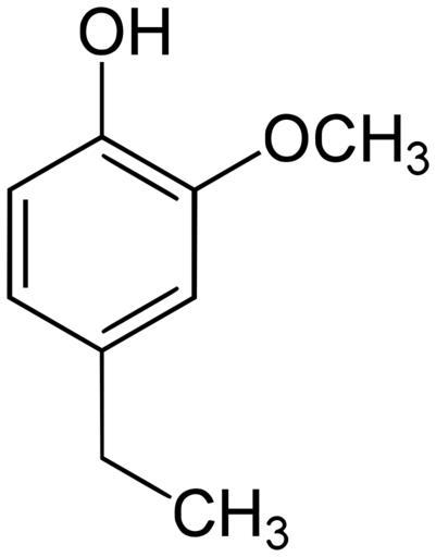 Keywords: 4-Ethylguaiacol.svg en 4-ethylguaiacol; p-Ethylguaiacol; 2-Methoxy-4-ethylphenol; 4-EP; Homocresol; Guaiacyl ethane de NN own Yikrazuul 2010-10-02 Hydroxyanisoles