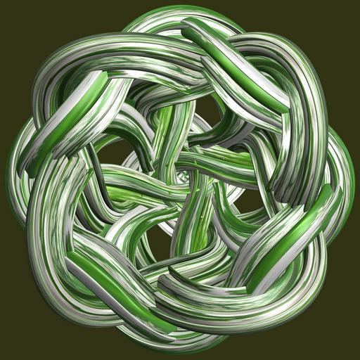 | Keywords: mathematica 3d cg parametricplot3d texture torus code program algorithm プログラム コード アルゴリズム 輪環 りんかん ドーナツ どーなつ トーラス とーらす knot 結び目 むすびめ mapping テクスチャ マッピング 模様 もよう design pattern デザイン パターン graphic グラフィック グラフィクス structure 意匠 構造 symmetry 対称性 たいしょうせい シンメトリー 対称 たいしょう tangle indoor abstract drawing a = 12; (* center hole size of a torus *) b1 = 5; (* the number of angles *) b2 = 4; (* the number of waves *) b3 = 2; (* the number of knots *) c = 10; (* distance from the center of rotation *) d = 4; (* the number of tori *) h1 = 3; (* width of a torus *) h2 = 2; (* width of a torus *) h3 = 3; (* height of cross *) SetOptions[ParametricPlot3D, PlotRange -> Full, Mesh -> None, Boxed -> False, Axes -> None, PlotPoints -> 500, ImageSize -> 3000, Background -> RGBColor[{50, 50, 20}/255], PlotStyle -> Directive[Specularity[White, 50], Texture[Import["D:/tmp/911.jpg"]]], TextureCoordinateFunction -> ({#4, #5 /Pi} &), Lighting -> "Neutral"]; x = (a - h1 Cos[t] + h2 Sin[b1 s]) Cos[b3 s]; y = (a - h1 Cos[t] + h2 Sin[b1 s]) Sin[b3 s]; z = h3 Cos[b1 s] + Sin[b2 t] + c; rm = Table[{x, y, z}.RotationMatrix[2 i Pi/d, {1, 0, 1}], {i, d}]; ParametricPlot3D[rm, {t, 0, 2 Pi}, {s, 0, 2 Pi}] (*--- The Texture *) a = 12; (* center hole size of a torus *) b1 = 5; (* the number of angles *) b2 = 4; (* the number of waves *) b3 = 2; (* the number of knots *) c = 10; (* distance from the center of rotation *) d = 4; (* the number of tori *) h1 = 3; (* width of a torus *) h2 = 2; (* width of a torus *) h3 = 3; (* height of cross *) SetOptions[ParametricPlot3D, PlotRange -> Full, Mesh -> None, Boxed -> False, Axes -> None, PlotPoints -> 500, ImageSize -> 3000, Background -> RGBColor[{50, 50, 20}/255], PlotStyle -> Directive[Specularity[White, 50], Texture[Import["D:/tmp/911.jpg"]]], TextureCoordinateFunction -> ({#4, #5 /Pi} &), Lighting -> "Neutral"]; x = (a - h1 Cos[t] + h2 Sin[b1 s]) Cos[b3 s]; y = (a - h1 Cos[t] + h2 Sin[b1 s]) Sin[b3 s]; z = h3 Cos[b1 s] + Sin[b2 t] + c; rm = Table[{x, y, z}.RotationMatrix[2 i Pi/d, {1, 0, 1}], {i, d}]; ParametricPlot3D[rm, {t, 0, 2 Pi}, {s, 0, 2 Pi}] (*--- The Texture *) |