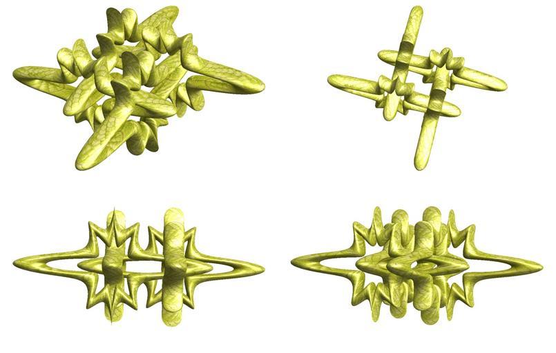 | Keywords: mathematica 3d cg parametricplot3d texture torus 輪環 りんかん ドーナツ どーなつ 八芒星 はちぼうせい program プログラム code コード algorithm コード アルゴリズム geometric sculpture geometricsculpture shape geometry sculpture mapping テクスチャ マッピング 模様 もよう design pattern デザイン パターン graphic グラフィック グラフィクス structure 意匠 構造 symmetry 対称性 たいしょうせい シンメトリー 対称 たいしょう algorithm white background monochrome plant foliage tree organic pattern a = 4; (* center hole size of a torus *) b = 8; (* octa-torus *) c = 3; (* distance from the center of rotation *) d = 4; (* number of torus *) SetOptions[ParametricPlot3D, PlotRange -> Full, Mesh -> None, Boxed -> False, Axes -> None, PlotPoints -> 400, ImageSize -> 1000, PlotStyle -> Directive[Specularity[White, 30], Texture[Import["D:/tmp/71.jpg"]]], TextureCoordinateFunction -> ({#4, #5 b Pi} &), Lighting -> "Neutral"]; g[v_] := Sum[Cos[(2 k - 1) v]/(2 k - 1), {k, 4}]; x = (a - Cos[t] - Sin[b s]) g[s + Pi/(2 b)] + c; y = Sin[t] + c; z = (a - Cos[t] - Sin[b s]) Sin[s + Pi/(2 b)] + c; rot = Table[{x, y, z}.RotationMatrix[2 i Pi/d, {0, 0, 1}], {i, d}]; ParametricPlot3D[rot, {t, 0, 2 Pi}, {s, 0, 2 Pi}] (*--- The Texture The g[] is a 4-partial sum of the Fourier series for Square wave. g[]は矩形波のフーリエ展開の最初の4項 *) a = 4; (* center hole size of a torus *) b = 8; (* octa-torus *) c = 3; (* distance from the center of rotation *) d = 4; (* number of torus *) SetOptions[ParametricPlot3D, PlotRange -> Full, Mesh -> None, Boxed -> False, Axes -> None, PlotPoints -> 400, ImageSize -> 1000, PlotStyle -> Directive[Specularity[White, 30], Texture[Import["D:/tmp/71.jpg"]]], TextureCoordinateFunction -> ({#4, #5 b Pi} &), Lighting -> "Neutral"]; g[v_] := Sum[Cos[(2 k - 1) v]/(2 k - 1), {k, 4}]; x = (a - Cos[t] - Sin[b s]) g[s + Pi/(2 b)] + c; y = Sin[t] + c; z = (a - Cos[t] - Sin[b s]) Sin[s + Pi/(2 b)] + c; rot = Table[{x, y, z}.RotationMatrix[2 i Pi/d, {0, 0, 1}], {i, d}]; ParametricPlot3D[rot, {t, 0, 2 Pi}, {s, 0, 2 Pi}] (*--- The Texture The g[] is a 4-partial sum of the Fourier series for Square wave. g[]は矩形波のフーリエ展開の最初の4項 *) |