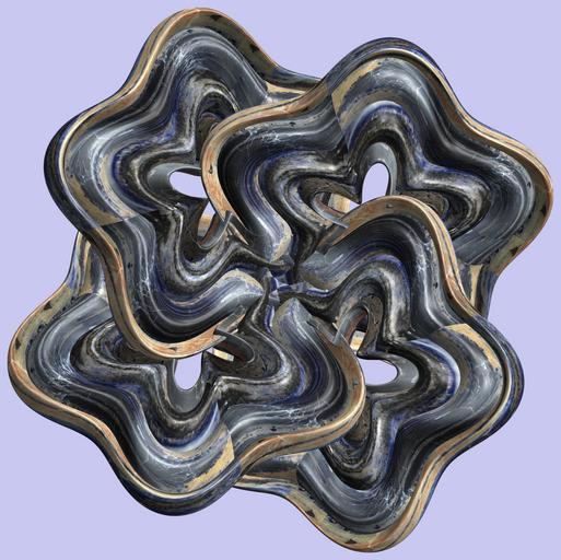 Keywords: mathematica 3d cg parametricplot3d texture torus code program algorithm プログラム コード アルゴリズム 輪環 りんかん ドーナツ どーなつ トーラス とーらす mapping テクスチャ マッピング 模様 もよう abstract 抽象 ちゅうしょう アブストラクト design pattern デザイン パターン graphic グラフィック グラフィクス structure 意匠 構造 symmetry 対称性 たいしょうせい シンメトリー 対称 たいしょう drawing door architecture indoor ancient white background painting surreal tangle a = 5; (* center hole size of a torus *) b1 = 5;(* the number of angles *) b2 = 4;(* the number of waves *) c = 4; (* distance from the center of rotation *) d = 4; (* the number of tori *) h1 = 3; (* width of a torus *) h2 = 1; (* width of a torus *) SetOptions[ParametricPlot3D, PlotRange -> Full, Mesh -> None, Boxed -> False, Axes -> None, PlotPoints -> 500, ImageSize -> 3000, Background -> RGBColor[{200, 200, 240}/255], PlotStyle -> Directive[Specularity[White, 70], Texture[Import["D:/tmp/94.jpg"]]], TextureCoordinateFunction -> ({#4, #5 Pi} &), Lighting -> "Neutral"]; f[v_] := Sin[2 Sin[Sin[Sin[v]]]]; x = (a - h1 Cos[t] + h2 f[b1 s]) Cos[s] + c; y = (a - h1 Cos[t] + h2 f[b1 s]) Sin[s] + c; z = f[b2 t]; rm = Table[{x, y, z}.RotationMatrix[2 i Pi/d, {0, 1, 2}], {i, d}]; ParametricPlot3D[rm, {t, 0, 2 Pi}, {s, 0, 2 Pi}] (*--- The Texture *) a = 5; (* center hole size of a torus *) b1 = 5;(* the number of angles *) b2 = 4;(* the number of waves *) c = 4; (* distance from the center of rotation *) d = 4; (* the number of tori *) h1 = 3; (* width of a torus *) h2 = 1; (* width of a torus *) SetOptions[ParametricPlot3D, PlotRange -> Full, Mesh -> None, Boxed -> False, Axes -> None, PlotPoints -> 500, ImageSize -> 3000, Background -> RGBColor[{200, 200, 240}/255], PlotStyle -> Directive[Specularity[White, 70], Texture[Import["D:/tmp/94.jpg"]]], TextureCoordinateFunction -> ({#4, #5 Pi} &), Lighting -> "Neutral"]; f[v_] := Sin[2 Sin[Sin[Sin[v]]]]; x = (a - h1 Cos[t] + h2 f[b1 s]) Cos[s] + c; y = (a - h1 Cos[t] + h2 f[b1 s]) Sin[s] + c; z = f[b2 t]; rm = Table[{x, y, z}.RotationMatrix[2 i Pi/d, {0, 1, 2}], {i, d}]; ParametricPlot3D[rm, {t, 0, 2 Pi}, {s, 0, 2 Pi}] (*--- The Texture *) |