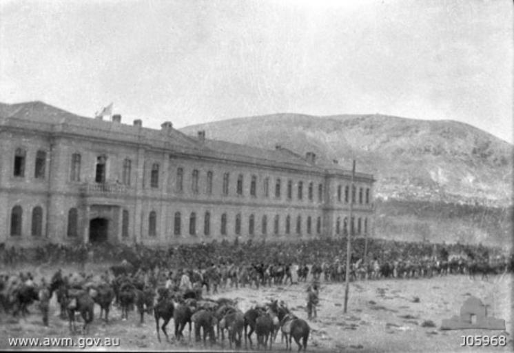 Keywords: 4ALHinDamascus.jpg watermark AWM caption THE SCENE AT THE TURKISH HOSPITAL AT DAMASCUS IN 1918 SHORTLY AFTER THE ENTRY OF THE 4TH ALH REGIMENT THE PICTURE SHOWS THE AUSTRALIANS ROUNDING UP THE 10 000 PRISONERS CAPTURED HERE ONE OF THE FIGURES IN THE CENTRE IS COLONEL BOURCHIER J05968 Credit line DONATED BY MR J A HENDERSON circa October 1918 photographer not identified Copyright expired - public domain PD-AustraliaGov World War I forces of Australia in Egypt and Palestine World War I forces of the Ottoman Empire in Egypt and Palestine World War I military hospitals Prisoners of war from the Ottoman Empire in World War I World War I cavalry Black and white photographs Ottoman Hospitals Damascus |