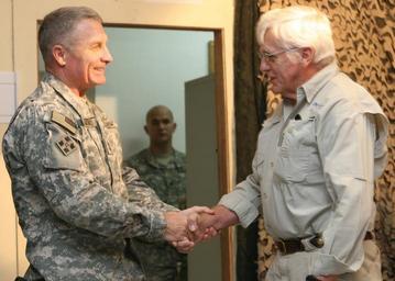 | Keywords: 4th Inf. Div. leaders focus Town Hall meeting in memory of 9-11 DVIDS118310.jpg en Maj Gen Jeffery Hammond a native of Hattiesburg Miss who is the commanding general of the 4th Infantry Division and Multi-National Division “ Baghdad warmly thanks Bob Everson a native of Townsville in Queensland Australia who serves as the manager of the Oasis water treatment plant on Camp Victory during the Ironhorse Division's monthly town hall meeting Sept 25 2008 2008-09-25 Spc Douglas York https //www dvidshub net/image/118310 118310 2008-09-26 14 13 BAGHDAD IQ PD-USGov Camp Victory Images from DoD uploaded by Fæ Jeffery W Hammond |