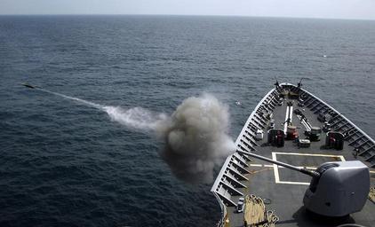 Keywords: 5450841935 41a2459189 o.jpg en The guided-missile cruiser USS Vella Gulf CG 72 fires a 5-inch MK-45 Mod 2 light-weight gun during a live fire exercise during Joint Task Force Exercise JTFEX 08-4 as a part of the Iwo Jima Expeditionary Strike Group 2008-07-27 http //www flickr com/photos/usnavy/5450841935/in/photostream/ U S Navy photo by Mass Communication Specialist Seaman Chad R Erdmann PD-USN 5 /54 caliber Mark 45 gun firing Uploaded with UploadWizard USS Vella Gulf CG-72 Iwo Jima Expeditionary Strike Group |