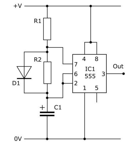 | Keywords: 555 Mk-sp Diagram.svg Circuit diagram of a 555 Astable circuit with variable mark-space ratio The design equations can be found http //en wikibooks org/w/index php title Practical_Electronics/Astables/555 Design_equations_2 here Own drawing made in Inkscape 0 43 2006-06-20 jjbeard PD 555 timer IC Astable circuits |