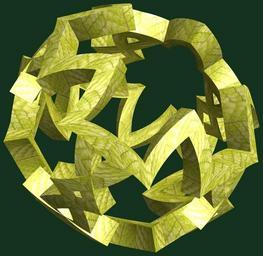 | Keywords: mathematica 3d cg parametricplot3d texture torus code program algorithm プログラム コード アルゴリズム 輪環 りんかん ドーナツ どーなつ 六芒星 ろくぼうせい geometric sculpture geometricsculpture shape geometry sculpture mapping テクスチャ マッピング 模様 もよう abstract 抽象 ちゅうしょう アブストラクト design pattern デザイン パターン graphic グラフィック グラフィクス structure 意匠 構造 symmetry 対称性 たいしょうせい シンメトリー 対称 たいしょう foliage plant leaf black background tree outdoor a = 4; (* center hole size *) b = 6; (* hexa-torus *) c = -9; (* distance from the center of rotation *) d = 5; (* number of torus *) h = 1; (* height of a torus *) SetOptions[ParametricPlot3D, PlotRange -> Full, Mesh -> None, Boxed -> False, Axes -> False, PlotPoints -> 400, ImageSize -> 3000, Background -> RGBColor[{20, 50, 30}/255], PlotStyle -> Directive[Specularity[White, 30], Texture[Import["D:/tmp/71.jpg"]]], TextureCoordinateFunction -> ({#4, #5 Pi} &), Lighting -> "Neutral"]; f[v_] := TriangleWave[{-1, 1}, v/(2 Pi)]; g[v_] := TriangleWave[{-1, 1}, v/(2 Pi) + 1/4]; x = (a - g[t] - f[b s]) Cos[s]; y = (a - g[t] - f[b s]) Sin[s]; z = (a - f[t] - h f[b s]) + c; rm = Table[{x, y, z}.RotationMatrix[2 i Pi/d, {1, 1, 0}], {i, d}]; ParametricPlot3D[rm, {t, 0, 2 Pi}, {s, 0, Pi}] (*--- The Texture *) a = 4; (* center hole size *) b = 6; (* hexa-torus *) c = -9; (* distance from the center of rotation *) d = 5; (* number of torus *) h = 1; (* height of a torus *) SetOptions[ParametricPlot3D, PlotRange -> Full, Mesh -> None, Boxed -> False, Axes -> False, PlotPoints -> 400, ImageSize -> 3000, Background -> RGBColor[{20, 50, 30}/255], PlotStyle -> Directive[Specularity[White, 30], Texture[Import["D:/tmp/71.jpg"]]], TextureCoordinateFunction -> ({#4, #5 Pi} &), Lighting -> "Neutral"]; f[v_] := TriangleWave[{-1, 1}, v/(2 Pi)]; g[v_] := TriangleWave[{-1, 1}, v/(2 Pi) + 1/4]; x = (a - g[t] - f[b s]) Cos[s]; y = (a - g[t] - f[b s]) Sin[s]; z = (a - f[t] - h f[b s]) + c; rm = Table[{x, y, z}.RotationMatrix[2 i Pi/d, {1, 1, 0}], {i, d}]; ParametricPlot3D[rm, {t, 0, 2 Pi}, {s, 0, Pi}] (*--- The Texture *) |
