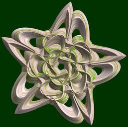 Keywords: mathematica 3d cg parametricplot3d texture torus 輪環 りんかん ドーナツ どーなつ 五芒星 ごぼうせい 五光星 ごこうせい 五稜星 ごりょうせい program プログラム code コード algorithm コード アルゴリズム pentagram geometric sculpture geometricsculpture shape geometry sculpture mapping テクスチャ マッピング 模様 もよう design pattern デザイン パターン graphic グラフィック グラフィクス structure 意匠 構造 symmetry 対称性 たいしょうせい シンメトリー 対称 たいしょう algorithm tangle black background organic pattern SetOptions[ParametricPlot3D, PlotRange -> Full, Mesh -> None, Boxed -> False, Axes -> None, PlotPoints -> 400, ImageSize -> 3000, Background -> Darker[Green, 0.8], PlotStyle -> Directive[Specularity[White, 30], Texture[Import["D:/tmp/862.jpg"]]], TextureCoordinateFunction -> ({#4 + #5, #5/Pi} &), Lighting -> "Neutral"]; a = 3; (* center hole size of a torus *) b = 5; (* penta-torus *) c = 1; (* distance from the center of rotation *) d = 5; (* number of torus *) f[v_] := TriangleWave[{-1, 1}, v/(2 Pi)]; g[v_] := TriangleWave[{-1, 1}, v/(2 Pi) + 1/4]; x = (a - g[t] - Sin[b s]) g[s + Pi/10] + c; y = f[t] + c; z = (a - g[t] - Sin[b s]) f[s + Pi/10] + c; rot = Table[{x, y, z}.RotationMatrix[i Pi/d, {0, 1, 0}], {i, d}]; ParametricPlot3D[rot, {t, 0, 2 Pi}, {s, 0, 2 Pi}] (* --- The Texture is another color version of this: www.flickr.com/photos/tanaka_juuyoh/5412528282 *) SetOptions[ParametricPlot3D, PlotRange -> Full, Mesh -> None, Boxed -> False, Axes -> None, PlotPoints -> 400, ImageSize -> 3000, Background -> Darker[Green, 0.8], PlotStyle -> Directive[Specularity[White, 30], Texture[Import["D:/tmp/862.jpg"]]], TextureCoordinateFunction -> ({#4 + #5, #5/Pi} &), Lighting -> "Neutral"]; a = 3; (* center hole size of a torus *) b = 5; (* penta-torus *) c = 1; (* distance from the center of rotation *) d = 5; (* number of torus *) f[v_] := TriangleWave[{-1, 1}, v/(2 Pi)]; g[v_] := TriangleWave[{-1, 1}, v/(2 Pi) + 1/4]; x = (a - g[t] - Sin[b s]) g[s + Pi/10] + c; y = f[t] + c; z = (a - g[t] - Sin[b s]) f[s + Pi/10] + c; rot = Table[{x, y, z}.RotationMatrix[i Pi/d, {0, 1, 0}], {i, d}]; ParametricPlot3D[rot, {t, 0, 2 Pi}, {s, 0, 2 Pi}] (* --- The Texture is another color version of this: www.flickr.com/photos/tanaka_juuyoh/5412528282 *) |
