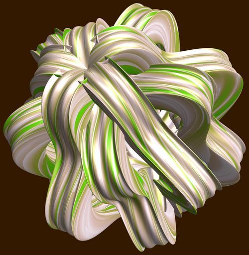 Keywords: mathematica 3d cg parametricplot3d texture torus 輪環 りんかん ドーナツ どーなつ 五芒星 ごぼうせい 五光星 ごこうせい 五稜星 ごりょうせい program プログラム code コード algorithm コード アルゴリズム pentagram geometric sculpture geometricsculpture shape geometry sculpture mapping テクスチャ マッピング 模様 もよう design pattern デザイン パターン graphic グラフィック グラフィクス structure 意匠 構造 symmetry 対称性 たいしょうせい シンメトリー 対称 たいしょう algorithm indoor pastel black background SetOptions[ParametricPlot3D, PlotRange -> Full, Mesh -> None, Boxed -> False, Axes -> None, PlotPoints -> 400, ImageSize -> 3000, Background -> Darker[Orange, 0.8], PlotStyle -> Directive[Specularity[White, 30], Texture[Import["D:/tmp/862.jpg"]]], TextureCoordinateFunction -> ({#4 + #5, #5/Pi} &), Lighting -> "Neutral"]; a = 5; (* center hole size of a torus *) b = 5; (* penta-torus *) c = 0;(* distance from the center of rotation *) d = 5; (* number of torus *) g[v_] := Sum[(-1)^(k + 1) Cos[(2 k - 1) v]/(2 k - 1), {k, 4}]; x = (a - g[t] - Sin[b s]) Cos[s] + c; y = Sin[t] + c; z = (a - g[t] - Sin[b s]) Sin[s] + c; rot = Table[{x, y, z}.RotationMatrix[2 i Pi/d, {1, 0, 0}], {i, d}]; ParametricPlot3D[rot, {t, 0, 2 Pi}, {s, 0, 2 Pi}] (*--- The Texture The g[] is a 4-partial sum of the Fourier series for Square wave. g[]は矩形波のフーリエ展開の最初の4項 *) SetOptions[ParametricPlot3D, PlotRange -> Full, Mesh -> None, Boxed -> False, Axes -> None, PlotPoints -> 400, ImageSize -> 3000, Background -> Darker[Orange, 0.8], PlotStyle -> Directive[Specularity[White, 30], Texture[Import["D:/tmp/862.jpg"]]], TextureCoordinateFunction -> ({#4 + #5, #5/Pi} &), Lighting -> "Neutral"]; a = 5; (* center hole size of a torus *) b = 5; (* penta-torus *) c = 0;(* distance from the center of rotation *) d = 5; (* number of torus *) g[v_] := Sum[(-1)^(k + 1) Cos[(2 k - 1) v]/(2 k - 1), {k, 4}]; x = (a - g[t] - Sin[b s]) Cos[s] + c; y = Sin[t] + c; z = (a - g[t] - Sin[b s]) Sin[s] + c; rot = Table[{x, y, z}.RotationMatrix[2 i Pi/d, {1, 0, 0}], {i, d}]; ParametricPlot3D[rot, {t, 0, 2 Pi}, {s, 0, 2 Pi}] (*--- The Texture The g[] is a 4-partial sum of the Fourier series for Square wave. g[]は矩形波のフーリエ展開の最初の4項 *) |