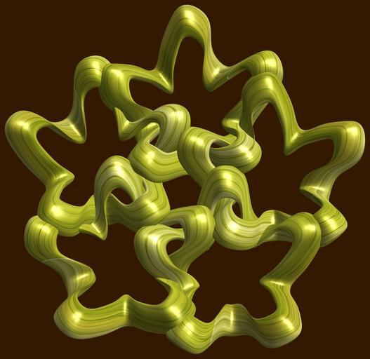Keywords: mathematica 3d cg parametricplot3d texture torus 輪環 りんかん ドーナツ どーなつ 五芒星 ごぼうせい 五光星 ごこうせい 五稜星 ごりょうせい code program algorithm コード プログラム アルゴリズム pentagram geometric sculpture geometricsculpture shape geometry sculpture mapping テクスチャ マッピング 模様 もよう abstract 抽象 ちゅうしょう アブストラクト design pattern デザイン パターン graphic グラフィック グラフィクス structure 意匠 構造 symmetry 対称性 たいしょうせい シンメトリー 対称 たいしょう algorithm コード indoor black background organic pattern bright a = 4; (* center hole size *) b = 5; (* penta-torus *) c = 4; (* distance from the center of rotation *) d = 5; (* number of torus *) h = 2; (* height of a torus *) SetOptions[ParametricPlot3D, PlotRange -> Full, Mesh -> None, Boxed -> False, Axes -> False, PlotPoints -> 400, ImageSize -> 3000, Background -> Darker[Orange, 0.8], PlotStyle -> Directive[Specularity[White, 30], Texture[Import["D:/tmp/71.jpg"]]], TextureCoordinateFunction -> ({#4 + #5, #5 / Pi} &), Lighting -> "Neutral"]; f[v_] := Sin[2 Sin[Sin[Sin[v]]]]; x = (a - Cos[t] - f[b s]) Cos[s] + c; y = (a - Cos[t] - Sin[b s]) Sin[s] + c; z = (a - Sin[t] - h Sin[b s]); rot = Table[{x, y, z}.RotationMatrix[2 i Pi/d, {0, 0, 1}], {i, d}]; ParametricPlot3D[rot, {t, 0, 2 Pi}, {s, 0, 2 Pi}] (*--- The Texture is this: www.flickr.com/photos/tanaka_juuyoh/5239255695/ *) a = 4; (* center hole size *) b = 5; (* penta-torus *) c = 4; (* distance from the center of rotation *) d = 5; (* number of torus *) h = 2; (* height of a torus *) SetOptions[ParametricPlot3D, PlotRange -> Full, Mesh -> None, Boxed -> False, Axes -> False, PlotPoints -> 400, ImageSize -> 3000, Background -> Darker[Orange, 0.8], PlotStyle -> Directive[Specularity[White, 30], Texture[Import["D:/tmp/71.jpg"]]], TextureCoordinateFunction -> ({#4 + #5, #5 / Pi} &), Lighting -> "Neutral"]; f[v_] := Sin[2 Sin[Sin[Sin[v]]]]; x = (a - Cos[t] - f[b s]) Cos[s] + c; y = (a - Cos[t] - Sin[b s]) Sin[s] + c; z = (a - Sin[t] - h Sin[b s]); rot = Table[{x, y, z}.RotationMatrix[2 i Pi/d, {0, 0, 1}], {i, d}]; ParametricPlot3D[rot, {t, 0, 2 Pi}, {s, 0, 2 Pi}] (*--- The Texture is this: www.flickr.com/photos/tanaka_juuyoh/5239255695/ *) |