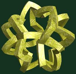 Keywords: mathematica 3d cg parametricplot3d texture torus code program algorithm プログラム コード アルゴリズム 輪環 りんかん ドーナツ どーなつ 五芒星 ごぼうせい geometric sculpture geometricsculpture shape geometry sculpture mapping テクスチャ マッピング 模様 もよう abstract 抽象 ちゅうしょう アブストラクト design pattern デザイン パターン graphic グラフィック グラフィクス structure 意匠 構造 symmetry 対称性 たいしょうせい シンメトリー 対称 たいしょう ancient black background plant leaf foliage organic pattern a = 6; (* center hole size *) b = 5; (* penta-torus *) c = -2; (* distance from the center of rotation *) d = 5; (* number of torus *) h = 1; (* height of a torus *) SetOptions[ParametricPlot3D, PlotRange -> Full, Mesh -> None, Boxed -> False, Axes -> False, PlotPoints -> 400, ImageSize -> 3000, Background -> RGBColor[{20, 50, 30}/255], PlotStyle -> Directive[Specularity[White, 30], Texture[Import["D:/tmp/71.jpg"]]], TextureCoordinateFunction -> ({#4, #5 Pi} &), Lighting -> "Neutral"]; f[v_] := TriangleWave[{-1, 1}, v/(2 Pi)]; g[v_] := TriangleWave[{-1, 1}, v/(2 Pi) + 1/4]; x = (a - g[t] - f[b s]) Cos[s]; y = (a - g[t] - f[b s]) Sin[s]; z = (a - f[t] - h f[b s]) + c; rm = Table[{x, y, z}.RotationMatrix[2 i Pi/d, {1, 1, 0}], {i, d}]; ParametricPlot3D[rm, {t, 0, 2 Pi}, {s, 0, Pi}] (*--- The Texture *) a = 6; (* center hole size *) b = 5; (* penta-torus *) c = -2; (* distance from the center of rotation *) d = 5; (* number of torus *) h = 1; (* height of a torus *) SetOptions[ParametricPlot3D, PlotRange -> Full, Mesh -> None, Boxed -> False, Axes -> False, PlotPoints -> 400, ImageSize -> 3000, Background -> RGBColor[{20, 50, 30}/255], PlotStyle -> Directive[Specularity[White, 30], Texture[Import["D:/tmp/71.jpg"]]], TextureCoordinateFunction -> ({#4, #5 Pi} &), Lighting -> "Neutral"]; f[v_] := TriangleWave[{-1, 1}, v/(2 Pi)]; g[v_] := TriangleWave[{-1, 1}, v/(2 Pi) + 1/4]; x = (a - g[t] - f[b s]) Cos[s]; y = (a - g[t] - f[b s]) Sin[s]; z = (a - f[t] - h f[b s]) + c; rm = Table[{x, y, z}.RotationMatrix[2 i Pi/d, {1, 1, 0}], {i, d}]; ParametricPlot3D[rm, {t, 0, 2 Pi}, {s, 0, Pi}] (*--- The Texture *) |