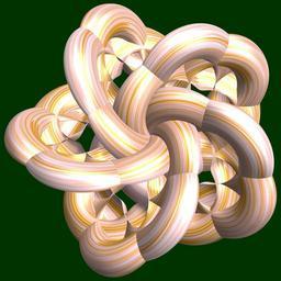 Keywords: mathematica 3d cg parametricplot3d texture torus 輪環 りんかん ドーナツ どーなつ 五芒星 ごぼうせい 五光星 ごこうせい 五稜星 ごりょうせい program プログラム code コード algorithm コード アルゴリズム pentagram geometric sculpture geometricsculpture shape geometry sculpture mapping テクスチャ マッピング 模様 もよう abstract 抽象 ちゅうしょう アブストラクト design pattern デザイン パターン graphic グラフィック グラフィクス structure 意匠 構造 symmetry 対称性 たいしょうせい シンメトリー 対称 たいしょう algorithm bright food pastel wheel black background serene SetOptions[ParametricPlot3D, PlotRange -> Full, Mesh -> None, Boxed -> False, Axes -> None, PlotPoints -> 400, ImageSize -> 3000, Background -> Darker[Green, 0.8], PlotStyle -> Directive[Specularity[White, 30], Texture[Import["D:/tmp/861.jpg"]]], TextureCoordinateFunction -> ({#4 + #5, #5/Pi} &), Lighting -> "Neutral"]; a = 3; (* center hole size of a torus *) b = 5; (* penta-torus *) c = 3; (* distance from the center of rotation *) d = 5; (* number of torus *) v = 3; w = 0.5; x = (a - Cos[w t] - Sin[b s]) Cos[v s] + c; y = Sin[w t] Sin[b s] + c; z = (a - Cos[w t] - Sin[b s]) Sin[v s] + c; rot = Table[{x, y, z}.RotationMatrix[2 i Pi/d, {1, 1, 0}], {i, d}]; ParametricPlot3D[rot, {t, 0, 2 Pi}, {s, 0, 2 Pi}] (*--- The Texture *) SetOptions[ParametricPlot3D, PlotRange -> Full, Mesh -> None, Boxed -> False, Axes -> None, PlotPoints -> 400, ImageSize -> 3000, Background -> Darker[Green, 0.8], PlotStyle -> Directive[Specularity[White, 30], Texture[Import["D:/tmp/861.jpg"]]], TextureCoordinateFunction -> ({#4 + #5, #5/Pi} &), Lighting -> "Neutral"]; a = 3; (* center hole size of a torus *) b = 5; (* penta-torus *) c = 3; (* distance from the center of rotation *) d = 5; (* number of torus *) v = 3; w = 0.5; x = (a - Cos[w t] - Sin[b s]) Cos[v s] + c; y = Sin[w t] Sin[b s] + c; z = (a - Cos[w t] - Sin[b s]) Sin[v s] + c; rot = Table[{x, y, z}.RotationMatrix[2 i Pi/d, {1, 1, 0}], {i, d}]; ParametricPlot3D[rot, {t, 0, 2 Pi}, {s, 0, 2 Pi}] (*--- The Texture *) |