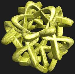 | Keywords: mathematica 3d cg parametricplot3d texture torus 輪環 りんかん ドーナツ どーなつ 五芒星 ごぼうせい 五光星 ごこうせい 五稜星 ごりょうせい code program algorithm コード プログラム アルゴリズム pentagram geometric sculpture geometricsculpture shape geometry sculpture mapping テクスチャ マッピング 模様 もよう abstract 抽象 ちゅうしょう アブストラクト design pattern デザイン パターン graphic グラフィック グラフィクス structure 意匠 構造 symmetry 対称性 たいしょうせい シンメトリー 対称 たいしょう algorithm コード black background indoor food a = 8; (* center hole size of a torus *) b = 5; (* penta-torus *) c = -5; (* distance from the center of rotation *) d = 5; (* number of torus *) h = 3; (* height of a torus *) SetOptions[ParametricPlot3D, PlotRange -> Full, Mesh -> None, Boxed -> False, Axes -> False, PlotPoints -> 400, ImageSize -> 3000, Background -> RGBColor[{30, 30, 30}/255], PlotStyle -> Directive[Specularity[White, 30], Texture[Import["D:/tmp/71.jpg"]]], TextureCoordinateFunction -> ({#4, #5 b Pi} &), Lighting -> "Neutral"]; f[v_] := Sin[2 Sin[Sin[Sin[v]]]]; x = (a - Cos[t] - Sin[b s]) Cos[s + Pi/(2 b)]; y = (a - Cos[t] - Sin[b s]) Sin[s + Pi/(2 b)]; z = (a - f[t] - h Sin[b s]) + c; rm = Table[{x, y, z}.RotationMatrix[2 i Pi/d, {1, 0, 0}], {i, d}]; ParametricPlot3D[rm, {t, 0, 2 Pi}, {s, 0, 2 Pi}] (*--- The Texture *) a = 8; (* center hole size of a torus *) b = 5; (* penta-torus *) c = -5; (* distance from the center of rotation *) d = 5; (* number of torus *) h = 3; (* height of a torus *) SetOptions[ParametricPlot3D, PlotRange -> Full, Mesh -> None, Boxed -> False, Axes -> False, PlotPoints -> 400, ImageSize -> 3000, Background -> RGBColor[{30, 30, 30}/255], PlotStyle -> Directive[Specularity[White, 30], Texture[Import["D:/tmp/71.jpg"]]], TextureCoordinateFunction -> ({#4, #5 b Pi} &), Lighting -> "Neutral"]; f[v_] := Sin[2 Sin[Sin[Sin[v]]]]; x = (a - Cos[t] - Sin[b s]) Cos[s + Pi/(2 b)]; y = (a - Cos[t] - Sin[b s]) Sin[s + Pi/(2 b)]; z = (a - f[t] - h Sin[b s]) + c; rm = Table[{x, y, z}.RotationMatrix[2 i Pi/d, {1, 0, 0}], {i, d}]; ParametricPlot3D[rm, {t, 0, 2 Pi}, {s, 0, 2 Pi}] (*--- The Texture *) |