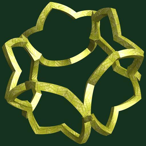 Keywords: mathematica 3d cg parametricplot3d texture torus code program algorithm プログラム コード アルゴリズム 輪環 りんかん ドーナツ どーなつ 五芒星 ごぼうせい geometric sculpture geometricsculpture shape geometry sculpture mapping テクスチャ マッピング 模様 もよう abstract 抽象 ちゅうしょう アブストラクト design pattern デザイン パターン graphic グラフィック グラフィクス structure 意匠 構造 symmetry 対称性 たいしょうせい シンメトリー 対称 たいしょう black background curve ancient foliage plant a = 8; (* center hole size *) b = 5; (* penta-torus *) c = 3; (* distance from the center of rotation *) d = 5; (* number of torus *) h = 1; (* height of a torus *) SetOptions[ParametricPlot3D, PlotRange -> Full, Mesh -> None, Boxed -> False, Axes -> False, PlotPoints -> 400, ImageSize -> 3000, Background -> RGBColor[{20, 50, 30}/255], PlotStyle -> Directive[Specularity[White, 30], Texture[Import["D:/tmp/71.jpg"]]], TextureCoordinateFunction -> ({#4, #5 Pi} &), Lighting -> "Neutral"]; f[v_] := TriangleWave[{-1, 1}, v/(2 Pi)]; g[v_] := TriangleWave[{-1, 1}, v/(2 Pi) + 1/4]; x = (a - g[t] - f[b s]) Cos[s + 3 Pi/(4 b)]; y = (a - g[t] - f[b s]) Sin[s + 3 Pi/(4 b)]; z = (a - f[t] - h f[b s]) + c; rm = Table[{x, y, z}.RotationMatrix[2 i Pi/d, {1, 1, 0}], {i, d}]; ParametricPlot3D[rm, {t, 0, 2 Pi}, {s, 0, Pi}] (*--- The Texture *) a = 8; (* center hole size *) b = 5; (* penta-torus *) c = 3; (* distance from the center of rotation *) d = 5; (* number of torus *) h = 1; (* height of a torus *) SetOptions[ParametricPlot3D, PlotRange -> Full, Mesh -> None, Boxed -> False, Axes -> False, PlotPoints -> 400, ImageSize -> 3000, Background -> RGBColor[{20, 50, 30}/255], PlotStyle -> Directive[Specularity[White, 30], Texture[Import["D:/tmp/71.jpg"]]], TextureCoordinateFunction -> ({#4, #5 Pi} &), Lighting -> "Neutral"]; f[v_] := TriangleWave[{-1, 1}, v/(2 Pi)]; g[v_] := TriangleWave[{-1, 1}, v/(2 Pi) + 1/4]; x = (a - g[t] - f[b s]) Cos[s + 3 Pi/(4 b)]; y = (a - g[t] - f[b s]) Sin[s + 3 Pi/(4 b)]; z = (a - f[t] - h f[b s]) + c; rm = Table[{x, y, z}.RotationMatrix[2 i Pi/d, {1, 1, 0}], {i, d}]; ParametricPlot3D[rm, {t, 0, 2 Pi}, {s, 0, Pi}] (*--- The Texture *) |