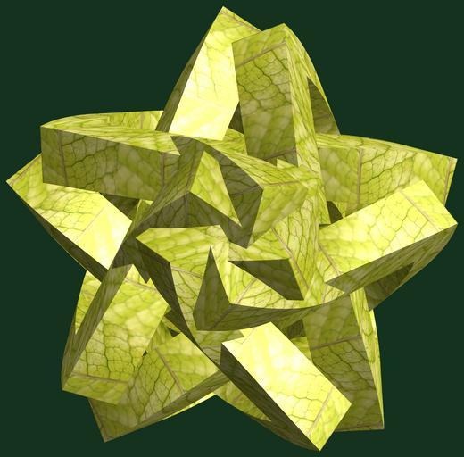 Keywords: mathematica 3d cg parametricplot3d texture torus code program algorithm プログラム コード アルゴリズム 輪環 りんかん ドーナツ どーなつ 五芒星 ごぼうせい geometric sculpture geometricsculpture shape geometry sculpture mapping テクスチャ マッピング 模様 もよう abstract 抽象 ちゅうしょう アブストラクト design pattern デザイン パターン graphic グラフィック グラフィクス structure 意匠 構造 symmetry 対称性 たいしょうせい シンメトリー 対称 たいしょう plant leaf foliage black background tree a = 4; (* center hole size *) b = 5; (* penta-torus *) c = -4; (* distance from the center of rotation *) d = 5; (* number of torus *) h = 1; (* height of a torus *) SetOptions[ParametricPlot3D, PlotRange -> Full, Mesh -> None, Boxed -> False, Axes -> False, PlotPoints -> 400, ImageSize -> 3000, Background -> RGBColor[{20, 50, 30}/255], PlotStyle -> Directive[Specularity[White, 30], Texture[Import["D:/tmp/71.jpg"]]], TextureCoordinateFunction -> ({#4, #5 Pi} &), Lighting -> "Neutral"]; f[v_] := TriangleWave[{-1, 1}, v/(2 Pi)]; g[v_] := TriangleWave[{-1, 1}, v/(2 Pi) + 1/4]; x = (a - g[t] - f[b s]) Cos[s + Pi/(2 b)]; y = (a - g[t] - f[b s]) Sin[s + Pi/(2 b)]; z = (a - f[t] - h f[b s]) + c; rm = Table[{x, y, z}.RotationMatrix[2 i Pi/d, {1, 1, 0}], {i, d}]; ParametricPlot3D[rm, {t, 0, 2 Pi}, {s, 0, Pi}] (*--- The Texture *) a = 4; (* center hole size *) b = 5; (* penta-torus *) c = -4; (* distance from the center of rotation *) d = 5; (* number of torus *) h = 1; (* height of a torus *) SetOptions[ParametricPlot3D, PlotRange -> Full, Mesh -> None, Boxed -> False, Axes -> False, PlotPoints -> 400, ImageSize -> 3000, Background -> RGBColor[{20, 50, 30}/255], PlotStyle -> Directive[Specularity[White, 30], Texture[Import["D:/tmp/71.jpg"]]], TextureCoordinateFunction -> ({#4, #5 Pi} &), Lighting -> "Neutral"]; f[v_] := TriangleWave[{-1, 1}, v/(2 Pi)]; g[v_] := TriangleWave[{-1, 1}, v/(2 Pi) + 1/4]; x = (a - g[t] - f[b s]) Cos[s + Pi/(2 b)]; y = (a - g[t] - f[b s]) Sin[s + Pi/(2 b)]; z = (a - f[t] - h f[b s]) + c; rm = Table[{x, y, z}.RotationMatrix[2 i Pi/d, {1, 1, 0}], {i, d}]; ParametricPlot3D[rm, {t, 0, 2 Pi}, {s, 0, Pi}] (*--- The Texture *) |