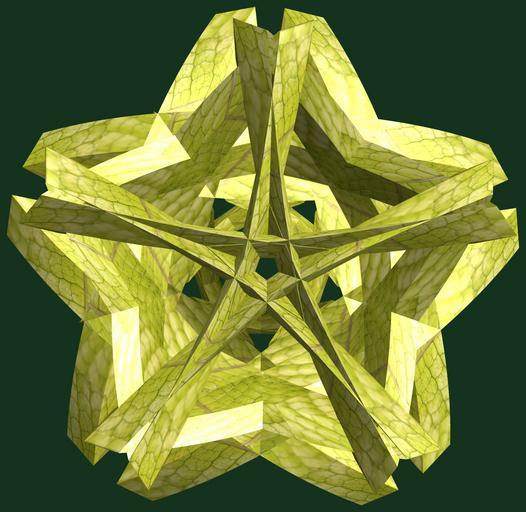 Keywords: mathematica 3d cg parametricplot3d texture torus code program algorithm プログラム コード アルゴリズム 輪環 りんかん ドーナツ どーなつ 五芒星 ごぼうせい geometric sculpture geometricsculpture shape geometry sculpture mapping テクスチャ マッピング 模様 もよう abstract 抽象 ちゅうしょう アブストラクト design pattern デザイン パターン graphic グラフィック グラフィクス structure 意匠 構造 symmetry 対称性 たいしょうせい シンメトリー 対称 たいしょう leaf plant foliage organic pattern black background tree outdoor forest landscape a = 5; (* center hole size *) b = 5; (* penta-torus *) c = -3; (* distance from the center of rotation *) d = 5; (* number of torus *) h = 4; (* height of a torus *) SetOptions[ParametricPlot3D, PlotRange -> Full, Mesh -> None, Boxed -> False, Axes -> False, PlotPoints -> 400, ImageSize -> 3000, Background -> RGBColor[{20, 50, 30}/255], PlotStyle -> Directive[Specularity[White, 30], Texture[Import["D:/tmp/71.jpg"]]], TextureCoordinateFunction -> ({#4, #5 Pi} &), Lighting -> "Neutral"]; f[v_] := TriangleWave[{-1, 1}, v/(2 Pi)]; g[v_] := TriangleWave[{-1, 1}, v/(2 Pi) + 1/4]; x = (a - g[t] - f[b s]) Cos[s + 3 Pi/(4 b)]; y = (a - g[t] - f[b s]) Sin[s + 3 Pi/(4 b)]; z = (a - f[t] - h f[b s]) + c; rm = Table[{x, y, z}.RotationMatrix[2 i Pi/d, {1, 1, 0}], {i, d}]; ParametricPlot3D[rm, {t, 0, 2 Pi}, {s, 0, Pi}] (*--- The Texture *) a = 5; (* center hole size *) b = 5; (* penta-torus *) c = -3; (* distance from the center of rotation *) d = 5; (* number of torus *) h = 4; (* height of a torus *) SetOptions[ParametricPlot3D, PlotRange -> Full, Mesh -> None, Boxed -> False, Axes -> False, PlotPoints -> 400, ImageSize -> 3000, Background -> RGBColor[{20, 50, 30}/255], PlotStyle -> Directive[Specularity[White, 30], Texture[Import["D:/tmp/71.jpg"]]], TextureCoordinateFunction -> ({#4, #5 Pi} &), Lighting -> "Neutral"]; f[v_] := TriangleWave[{-1, 1}, v/(2 Pi)]; g[v_] := TriangleWave[{-1, 1}, v/(2 Pi) + 1/4]; x = (a - g[t] - f[b s]) Cos[s + 3 Pi/(4 b)]; y = (a - g[t] - f[b s]) Sin[s + 3 Pi/(4 b)]; z = (a - f[t] - h f[b s]) + c; rm = Table[{x, y, z}.RotationMatrix[2 i Pi/d, {1, 1, 0}], {i, d}]; ParametricPlot3D[rm, {t, 0, 2 Pi}, {s, 0, Pi}] (*--- The Texture *) |