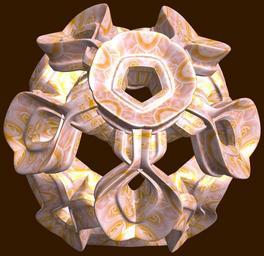 Keywords: mathematica 3d cg parametricplot3d texture torus 輪環 りんかん ドーナツ どーなつ 五芒星 ごぼうせい 五光星 ごこうせい 五稜星 ごりょうせい code program algorithm コード プログラム アルゴリズム pentagram geometric sculpture geometricsculpture shape geometry sculpture mapping テクスチャ マッピング 模様 もよう abstract 抽象 ちゅうしょう アブストラクト design pattern デザイン パターン graphic グラフィック グラフィクス structure 意匠 構造 symmetry 対称性 たいしょうせい シンメトリー 対称 たいしょう algorithm コード indoor black background a = 5; (* center hole size of a torus *) b = 5; (* penta-torus *) c = 8; (* distance from the center of rotation *) d = 5; (* number of torus *) h = 1; (* height of a torus *) SetOptions[ParametricPlot3D, PlotRange -> Full, Mesh -> None, Boxed -> False, Axes -> False, PlotPoints -> 400, ImageSize -> 1600, Background -> Darker[Orange, 0.8], PlotStyle -> Directive[Specularity[White, 30], Texture[Import["D:/tmp/861.jpg"]]], TextureCoordinateFunction -> ({#4, #5 2 Pi} &), Lighting -> "Neutral"]; f[v_] := Sin[2 Sin[Sin[Sin[v]]]]; g[v_] := Sum[Cos[(2 k - 1) v]/(2 k - 1), {k, 4}]; x = (a - g[t] - f[b s]) Cos[s + 3 Pi/(4 b)] + c; y = (a - g[t] - f[b s]) Sin[s + 3 Pi/(4 b)] + c; z = (a - Sin[t] - h f[b s]); rot = Table[{x, y, z}.RotationMatrix[2 i Pi/d, {1, 1, 1}], {i, d}]; ParametricPlot3D[rot, {t, 0, 2 Pi}, {s, 0, 2 Pi}] (*--- The Texture *) a = 5; (* center hole size of a torus *) b = 5; (* penta-torus *) c = 8; (* distance from the center of rotation *) d = 5; (* number of torus *) h = 1; (* height of a torus *) SetOptions[ParametricPlot3D, PlotRange -> Full, Mesh -> None, Boxed -> False, Axes -> False, PlotPoints -> 400, ImageSize -> 1600, Background -> Darker[Orange, 0.8], PlotStyle -> Directive[Specularity[White, 30], Texture[Import["D:/tmp/861.jpg"]]], TextureCoordinateFunction -> ({#4, #5 2 Pi} &), Lighting -> "Neutral"]; f[v_] := Sin[2 Sin[Sin[Sin[v]]]]; g[v_] := Sum[Cos[(2 k - 1) v]/(2 k - 1), {k, 4}]; x = (a - g[t] - f[b s]) Cos[s + 3 Pi/(4 b)] + c; y = (a - g[t] - f[b s]) Sin[s + 3 Pi/(4 b)] + c; z = (a - Sin[t] - h f[b s]); rot = Table[{x, y, z}.RotationMatrix[2 i Pi/d, {1, 1, 1}], {i, d}]; ParametricPlot3D[rot, {t, 0, 2 Pi}, {s, 0, 2 Pi}] (*--- The Texture *) |