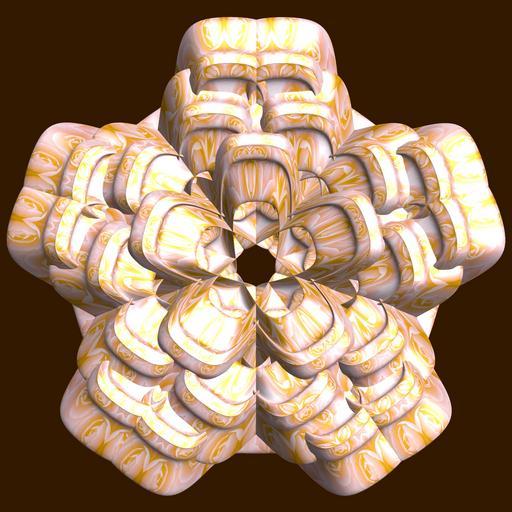 Keywords: mathematica 3d cg parametricplot3d texture torus 輪環 りんかん ドーナツ どーなつ 五芒星 ごぼうせい 五光星 ごこうせい 五稜星 ごりょうせい code program algorithm コード プログラム アルゴリズム pentagram geometric sculpture geometricsculpture shape geometry sculpture mapping テクスチャ マッピング 模様 もよう abstract 抽象 ちゅうしょう アブストラクト design pattern デザイン パターン graphic グラフィック グラフィクス structure 意匠 構造 symmetry 対称性 たいしょうせい シンメトリー 対称 たいしょう algorithm コード black background indoor a = 4; (* center hole size of a torus *) b = 5; (* penta-torus *) c = 1; (* distance from the center of rotation *) d = 5; (* number of torus *) h = 1; (* height of a torus *) SetOptions[ParametricPlot3D, PlotRange -> Full, Mesh -> None, Boxed -> False, Axes -> False, PlotPoints -> 400, ImageSize -> 3000, Background -> Darker[Orange, 0.8], PlotStyle -> Directive[Specularity[White, 30], Texture[Import["D:/tmp/861.jpg"]]], TextureCoordinateFunction -> ({#4, #5 2 Pi} &), Lighting -> "Neutral"]; f[v_] := Sin[2 Sin[Sin[Sin[v]]]]; g[v_] := Sum[Cos[(2 k - 1) v]/(2 k - 1), {k, 4}]; x = (a - g[t] - f[b s]) Cos[s + 3 Pi/(4 b)] + c; y = (a - g[t] - f[b s]) Sin[s + 3 Pi/(4 b)] + c; z = (a - Sin[t] - h f[b s]); rot = Table[{x, y, z}.RotationMatrix[2 i Pi/d, {0, 0, 1}], {i, d}]; ParametricPlot3D[rot, {t, 0, 2 Pi}, {s, 0, 2 Pi}] (*--- The Texture *) a = 4; (* center hole size of a torus *) b = 5; (* penta-torus *) c = 1; (* distance from the center of rotation *) d = 5; (* number of torus *) h = 1; (* height of a torus *) SetOptions[ParametricPlot3D, PlotRange -> Full, Mesh -> None, Boxed -> False, Axes -> False, PlotPoints -> 400, ImageSize -> 3000, Background -> Darker[Orange, 0.8], PlotStyle -> Directive[Specularity[White, 30], Texture[Import["D:/tmp/861.jpg"]]], TextureCoordinateFunction -> ({#4, #5 2 Pi} &), Lighting -> "Neutral"]; f[v_] := Sin[2 Sin[Sin[Sin[v]]]]; g[v_] := Sum[Cos[(2 k - 1) v]/(2 k - 1), {k, 4}]; x = (a - g[t] - f[b s]) Cos[s + 3 Pi/(4 b)] + c; y = (a - g[t] - f[b s]) Sin[s + 3 Pi/(4 b)] + c; z = (a - Sin[t] - h f[b s]); rot = Table[{x, y, z}.RotationMatrix[2 i Pi/d, {0, 0, 1}], {i, d}]; ParametricPlot3D[rot, {t, 0, 2 Pi}, {s, 0, 2 Pi}] (*--- The Texture *) |