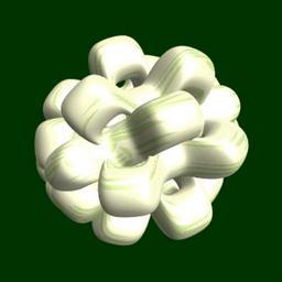Keywords: mathematica 3d cg parametricplot3d texture torus 輪環 りんかん ドーナツ どーなつ 五芒星 ごぼうせい 五光星 ごこうせい 五稜星 ごりょうせい geometric sculpture geometricsculpture shape geometry sculpture mapping テクスチャ マッピング 模様 もよう abstract 抽象 ちゅうしょう アブストラクト design pattern デザイン パターン graphic グラフィック グラフィクス structure 意匠 構造 symmetry 対称性 たいしょうせい シンメトリー 対称 たいしょう black background plant flower serene indoor frames = ParallelTable[Module[{}, a = 3; (* center hole size of a torus *) b = 5; (* hexa-torus *) c = 0; (* distance from the center of rotation *) d = 5; (* number of torus *) SetOptions[ParametricPlot3D, PlotRange -> 1.8 a, SphericalRegion -> True, Mesh -> None, Boxed -> False, Axes -> None, Background -> Darker[Green, 0.8], ViewVector -> vv, PlotPoints -> 200, PlotStyle -> Directive[Specularity[White, 30], Texture[ExampleData[{"ColorTexture", "BerriesPattern"}]]], TextureCoordinateFunction -> ({#4, #5} &), Lighting -> "Neutral"]; f[v_] := Sin[2 Sin[Sin[Sin[v]]]]; x = (a - Cos[t] - f[b s]) Cos[s] + c; y = Sin[t] + c; z = (a - Cos[t] - f[b s]) Sin[s] + c; rm = Table[{x, y, z}.RotationMatrix[2 i Pi/d, {1, 0, 0}], {i, d}]; ParametricPlot3D[rm, {t, 0, 2 Pi}, {s, 0, 2 Pi}] ], {vv, Table[{{5 a Cos[\[Theta]], 5 a Sin[\[Theta]], 10 a Sin[\[Theta]/2]}, {0, 0, 0}}, {\[Theta], 0, 4 Pi, Pi/30}]}]; Export["E:/tmp/Torus-179.avi", frames] frames = ParallelTable[Module[{}, a = 3; (* center hole size of a torus *) b = 5; (* hexa-torus *) c = 0; (* distance from the center of rotation *) d = 5; (* number of torus *) SetOptions[ParametricPlot3D, PlotRange -> 1.8 a, SphericalRegion -> True, Mesh -> None, Boxed -> False, Axes -> None, Background -> Darker[Green, 0.8], ViewVector -> vv, PlotPoints -> 200, PlotStyle -> Directive[Specularity[White, 30], Texture[ExampleData[{"ColorTexture", "BerriesPattern"}]]], TextureCoordinateFunction -> ({#4, #5} &), Lighting -> "Neutral"]; f[v_] := Sin[2 Sin[Sin[Sin[v]]]]; x = (a - Cos[t] - f[b s]) Cos[s] + c; y = Sin[t] + c; z = (a - Cos[t] - f[b s]) Sin[s] + c; rm = Table[{x, y, z}.RotationMatrix[2 i Pi/d, {1, 0, 0}], {i, d}]; ParametricPlot3D[rm, {t, 0, 2 Pi}, {s, 0, 2 Pi}] ], {vv, Table[{{5 a Cos[\[Theta]], 5 a Sin[\[Theta]], 10 a Sin[\[Theta]/2]}, {0, 0, 0}}, {\[Theta], 0, 4 Pi, Pi/30}]}]; Export["E:/tmp/Torus-179.avi", frames] |
