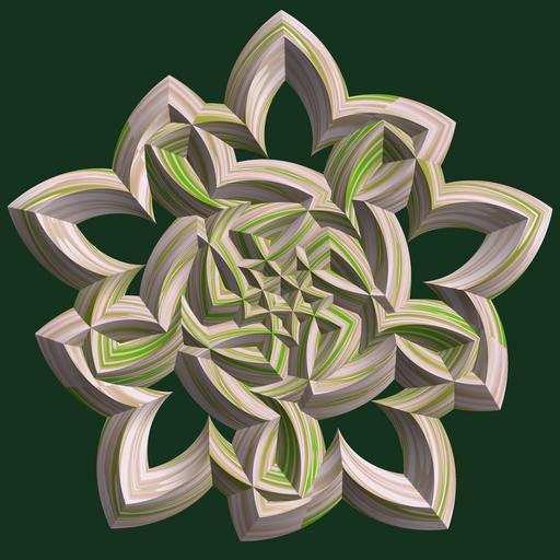 Keywords: mathematica 3d cg parametricplot3d texture torus code program algorithm プログラム コード アルゴリズム 輪環 りんかん ドーナツ どーなつ 五芒星 ごぼうせい geometric sculpture geometricsculpture shape geometry sculpture mapping テクスチャ マッピング 模様 もよう abstract 抽象 ちゅうしょう アブストラクト design pattern デザイン パターン graphic グラフィック グラフィクス structure 意匠 構造 symmetry 対称性 たいしょうせい シンメトリー 対称 たいしょう tangle indoor a = 3; (* center hole size *) b = 5; (* penta-torus *) c = 2.2; (* distance from the center of rotation *) d = 5; (* number of torus *) h = 0; (* height of a torus *) SetOptions[ParametricPlot3D, PlotRange -> Full, Mesh -> None, Boxed -> False, Axes -> False, PlotPoints -> 400, ImageSize -> 3000, Background -> RGBColor[{20, 50, 30}/255], PlotStyle -> Directive[Specularity[White, 70], Texture[Import["D:/tmp/862.jpg"]]], TextureCoordinateFunction -> ({#4 + #5, #5 / Pi} &), Lighting -> "Neutral"]; f[v_] := TriangleWave[{-1, 1}, v/(2 Pi)]; g[v_] := TriangleWave[{-1, 1}, v/(2 Pi) + 1/4]; x = (a - g[t] - f[b s]) Cos[s] + c; y = (a - g[t] - f[b s]) Sin[s] + c; z = (a - f[t] - h f[b s]); rm = Table[{x, y, z}.RotationMatrix[2 i Pi/d, {0, 0, 1}], {i, d}]; ParametricPlot3D[rm, {t, 0, 2 Pi}, {s, 0, Pi}] (*--- The Texture *) a = 3; (* center hole size *) b = 5; (* penta-torus *) c = 2.2; (* distance from the center of rotation *) d = 5; (* number of torus *) h = 0; (* height of a torus *) SetOptions[ParametricPlot3D, PlotRange -> Full, Mesh -> None, Boxed -> False, Axes -> False, PlotPoints -> 400, ImageSize -> 3000, Background -> RGBColor[{20, 50, 30}/255], PlotStyle -> Directive[Specularity[White, 70], Texture[Import["D:/tmp/862.jpg"]]], TextureCoordinateFunction -> ({#4 + #5, #5 / Pi} &), Lighting -> "Neutral"]; f[v_] := TriangleWave[{-1, 1}, v/(2 Pi)]; g[v_] := TriangleWave[{-1, 1}, v/(2 Pi) + 1/4]; x = (a - g[t] - f[b s]) Cos[s] + c; y = (a - g[t] - f[b s]) Sin[s] + c; z = (a - f[t] - h f[b s]); rm = Table[{x, y, z}.RotationMatrix[2 i Pi/d, {0, 0, 1}], {i, d}]; ParametricPlot3D[rm, {t, 0, 2 Pi}, {s, 0, Pi}] (*--- The Texture *) |