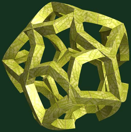Keywords: mathematica 3d cg parametricplot3d texture torus code program algorithm プログラム コード アルゴリズム 輪環 りんかん ドーナツ どーなつ 五芒星 ごぼうせい geometric sculpture geometricsculpture shape geometry sculpture mapping テクスチャ マッピング 模様 もよう abstract 抽象 ちゅうしょう アブストラクト design pattern デザイン パターン graphic グラフィック グラフィクス structure 意匠 構造 symmetry 対称性 たいしょうせい シンメトリー 対称 たいしょう plant leaf foliage ancient outdoor a = 8; (* center hole size *) b = 5; (* penta-torus *) c = -12; (* distance from the center of rotation *) d = 5; (* number of torus *) h = 1; (* height of a torus *) SetOptions[ParametricPlot3D, PlotRange -> Full, Mesh -> None, Boxed -> False, Axes -> False, PlotPoints -> 400, ImageSize -> 3000, Background -> RGBColor[{20, 50, 30}/255], PlotStyle -> Directive[Specularity[White, 30], Texture[Import["D:/tmp/71.jpg"]]], TextureCoordinateFunction -> ({#4, #5 Pi} &), Lighting -> "Neutral"]; f[v_] := TriangleWave[{-1, 1}, v/(2 Pi)]; g[v_] := TriangleWave[{-1, 1}, v/(2 Pi) + 1/4]; x = (a - g[t] - f[b s]) Cos[s + 3 Pi/(4 b)]; y = (a - g[t] - f[b s]) Sin[s + 3 Pi/(4 b)]; z = (a - f[t] - h f[b s]) + c; rm = Table[{x, y, z}.RotationMatrix[2 i Pi/d, {1, 1, 0}], {i, d}]; ParametricPlot3D[rm, {t, 0, 2 Pi}, {s, 0, Pi}] (*--- The Texture *) a = 8; (* center hole size *) b = 5; (* penta-torus *) c = -12; (* distance from the center of rotation *) d = 5; (* number of torus *) h = 1; (* height of a torus *) SetOptions[ParametricPlot3D, PlotRange -> Full, Mesh -> None, Boxed -> False, Axes -> False, PlotPoints -> 400, ImageSize -> 3000, Background -> RGBColor[{20, 50, 30}/255], PlotStyle -> Directive[Specularity[White, 30], Texture[Import["D:/tmp/71.jpg"]]], TextureCoordinateFunction -> ({#4, #5 Pi} &), Lighting -> "Neutral"]; f[v_] := TriangleWave[{-1, 1}, v/(2 Pi)]; g[v_] := TriangleWave[{-1, 1}, v/(2 Pi) + 1/4]; x = (a - g[t] - f[b s]) Cos[s + 3 Pi/(4 b)]; y = (a - g[t] - f[b s]) Sin[s + 3 Pi/(4 b)]; z = (a - f[t] - h f[b s]) + c; rm = Table[{x, y, z}.RotationMatrix[2 i Pi/d, {1, 1, 0}], {i, d}]; ParametricPlot3D[rm, {t, 0, 2 Pi}, {s, 0, Pi}] (*--- The Texture *) |