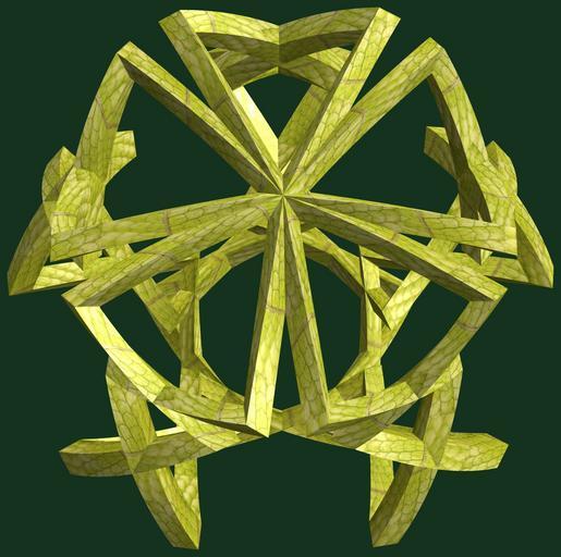 Keywords: mathematica 3d cg parametricplot3d texture torus code program algorithm プログラム コード アルゴリズム 輪環 りんかん ドーナツ どーなつ 五芒星 ごぼうせい geometric sculpture geometricsculpture shape geometry sculpture mapping テクスチャ マッピング 模様 もよう abstract 抽象 ちゅうしょう アブストラクト design pattern デザイン パターン graphic グラフィック グラフィクス structure 意匠 構造 symmetry 対称性 たいしょうせい シンメトリー 対称 たいしょう outdoor plant foliage organic pattern black background leaf a = 12; (* center hole size *) b = 5; (* penta-torus *) c = -8; (* distance from the center of rotation *) d = 5; (* number of torus *) h = 4; (* height of a torus *) SetOptions[ParametricPlot3D, PlotRange -> Full, Mesh -> None, Boxed -> False, Axes -> False, PlotPoints -> 400, ImageSize -> 3000, Background -> RGBColor[{20, 50, 30}/255], PlotStyle -> Directive[Specularity[White, 30], Texture[Import["D:/tmp/71.jpg"]]], TextureCoordinateFunction -> ({#4, #5 Pi} &), Lighting -> "Neutral"]; f[v_] := TriangleWave[{-1, 1}, v/(2 Pi)]; g[v_] := TriangleWave[{-1, 1}, v/(2 Pi) + 1/4]; x = (a - g[t] - f[b s]) Cos[s + 3 Pi/(4 b)]; y = (a - g[t] - f[b s]) Sin[s + 3 Pi/(4 b)]; z = (a - f[t] - h f[b s]) + c; rm = Table[{x, y, z}.RotationMatrix[2 i Pi/d, {1, 1, 0}], {i, d}]; ParametricPlot3D[rm, {t, 0, 2 Pi}, {s, 0, Pi}] (*--- The Texture *) a = 12; (* center hole size *) b = 5; (* penta-torus *) c = -8; (* distance from the center of rotation *) d = 5; (* number of torus *) h = 4; (* height of a torus *) SetOptions[ParametricPlot3D, PlotRange -> Full, Mesh -> None, Boxed -> False, Axes -> False, PlotPoints -> 400, ImageSize -> 3000, Background -> RGBColor[{20, 50, 30}/255], PlotStyle -> Directive[Specularity[White, 30], Texture[Import["D:/tmp/71.jpg"]]], TextureCoordinateFunction -> ({#4, #5 Pi} &), Lighting -> "Neutral"]; f[v_] := TriangleWave[{-1, 1}, v/(2 Pi)]; g[v_] := TriangleWave[{-1, 1}, v/(2 Pi) + 1/4]; x = (a - g[t] - f[b s]) Cos[s + 3 Pi/(4 b)]; y = (a - g[t] - f[b s]) Sin[s + 3 Pi/(4 b)]; z = (a - f[t] - h f[b s]) + c; rm = Table[{x, y, z}.RotationMatrix[2 i Pi/d, {1, 1, 0}], {i, d}]; ParametricPlot3D[rm, {t, 0, 2 Pi}, {s, 0, Pi}] (*--- The Texture *) |