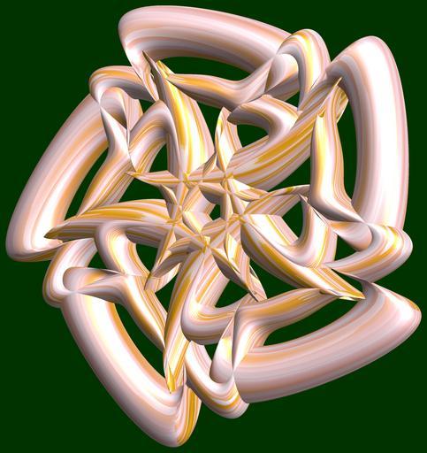 Keywords: mathematica 3d cg parametricplot3d texture torus 輪環 りんかん ドーナツ どーなつ 五芒星 ごぼうせい ごこうせい 五光星 五稜星 ごりょうせい program プログラム code コード algorithm コード アルゴリズム pentagram geometric sculpture geometricsculpture shape geometry sculpture mapping テクスチャ マッピング 模様 もよう design pattern デザイン パターン graphic グラフィック グラフィクス structure 意匠 構造 symmetry 対称性 たいしょうせい シンメトリー 対称 たいしょう algorithm black background food plant tangle flower SetOptions[ParametricPlot3D, PlotRange -> Full, Mesh -> None, Boxed -> False, Axes -> None, PlotPoints -> 400, ImageSize -> 3000, Background -> Darker[Green, 0.8], PlotStyle -> Directive[Specularity[White, 30], Texture[Import["D:/tmp/861.jpg"]]], TextureCoordinateFunction -> ({#4 + #5, #5/Pi} &), Lighting -> "Neutral"]; a = 4; (* center hole size of a torus *) b = 5; (* penta-torus *) c = 2; (* distance from the center of rotation *) d = 5; (* number of torus *) f[v_] := Sum[Sin[(2 k - 1) v]/(2 k - 1), {k, 4}]; x = (a - Cos[t] - Sin[b s]) Cos[s + Pi/(2 b)] + c; y = Sin[t] + c; z = (a - Cos[t] - Sin[b s]) f[s + Pi/(2 b)] + c; rot = Table[{x, y, z}.RotationMatrix[2 i Pi/d, {0, 1, 0}], {i, d}]; ParametricPlot3D[rot, {t, 0, 2 Pi}, {s, 0, 2 Pi}] (*--- The Texture The g[] is a 4-partial sum of the Fourier series for Square wave. g[]は矩形波のフーリエ展開の最初の4項 *) SetOptions[ParametricPlot3D, PlotRange -> Full, Mesh -> None, Boxed -> False, Axes -> None, PlotPoints -> 400, ImageSize -> 3000, Background -> Darker[Green, 0.8], PlotStyle -> Directive[Specularity[White, 30], Texture[Import["D:/tmp/861.jpg"]]], TextureCoordinateFunction -> ({#4 + #5, #5/Pi} &), Lighting -> "Neutral"]; a = 4; (* center hole size of a torus *) b = 5; (* penta-torus *) c = 2; (* distance from the center of rotation *) d = 5; (* number of torus *) f[v_] := Sum[Sin[(2 k - 1) v]/(2 k - 1), {k, 4}]; x = (a - Cos[t] - Sin[b s]) Cos[s + Pi/(2 b)] + c; y = Sin[t] + c; z = (a - Cos[t] - Sin[b s]) f[s + Pi/(2 b)] + c; rot = Table[{x, y, z}.RotationMatrix[2 i Pi/d, {0, 1, 0}], {i, d}]; ParametricPlot3D[rot, {t, 0, 2 Pi}, {s, 0, 2 Pi}] (*--- The Texture The g[] is a 4-partial sum of the Fourier series for Square wave. g[]は矩形波のフーリエ展開の最初の4項 *) |