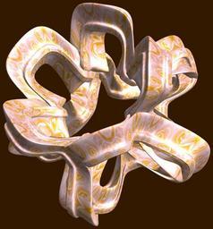 Keywords: mathematica 3d cg parametricplot3d texture torus 輪環 りんかん ドーナツ どーなつ 三芒星 さんぼうせい 三光星 さんこうせい 三稜星 さんりょうせい code program algorithm コード プログラム アルゴリズム geometric sculpture geometricsculpture shape geometry sculpture mapping テクスチャ マッピング 模様 もよう abstract 抽象 ちゅうしょう アブストラクト design pattern デザイン パターン graphic グラフィック グラフィクス structure 意匠 構造 symmetry 対称性 たいしょうせい シンメトリー 対称 たいしょう algorithm コード black background surreal indoor a = 3; (* center hole size of a torus *) b = 3; (* tri-torus *) c = 1; (* distance from the center of rotation *) d = 5; (* number of torus *) h = 1; (* height of a torus *) SetOptions[ParametricPlot3D, PlotRange -> Full, Mesh -> None, Boxed -> False, Axes -> False, PlotPoints -> 400, ImageSize -> 3000, Background -> Darker[Orange, 0.8], PlotStyle -> Directive[Specularity[White, 30], Texture[Import["D:/tmp/861.jpg"]]], TextureCoordinateFunction -> ({#4, #5 2 Pi} &), Lighting -> "Neutral"]; f[v_] := Sin[2 Sin[Sin[Sin[v]]]]; g[v_] := Sum[Cos[(2 k - 1) v]/(2 k - 1), {k, 4}]; x = (a - g[t] - f[b s]) Cos[s] + c; y = (a - g[t] - f[b s]) Sin[s] + c; z = (a - Sin[t] - h f[b s]) + c; rot = Table[{x, y, z}.RotationMatrix[2 i Pi/d, {2, 1, 0}], {i, d}]; ParametricPlot3D[rot, {t, 0, 2 Pi}, {s, 0, 2 Pi}] (*--- The Texture *) a = 3; (* center hole size of a torus *) b = 3; (* tri-torus *) c = 1; (* distance from the center of rotation *) d = 5; (* number of torus *) h = 1; (* height of a torus *) SetOptions[ParametricPlot3D, PlotRange -> Full, Mesh -> None, Boxed -> False, Axes -> False, PlotPoints -> 400, ImageSize -> 3000, Background -> Darker[Orange, 0.8], PlotStyle -> Directive[Specularity[White, 30], Texture[Import["D:/tmp/861.jpg"]]], TextureCoordinateFunction -> ({#4, #5 2 Pi} &), Lighting -> "Neutral"]; f[v_] := Sin[2 Sin[Sin[Sin[v]]]]; g[v_] := Sum[Cos[(2 k - 1) v]/(2 k - 1), {k, 4}]; x = (a - g[t] - f[b s]) Cos[s] + c; y = (a - g[t] - f[b s]) Sin[s] + c; z = (a - Sin[t] - h f[b s]) + c; rot = Table[{x, y, z}.RotationMatrix[2 i Pi/d, {2, 1, 0}], {i, d}]; ParametricPlot3D[rot, {t, 0, 2 Pi}, {s, 0, 2 Pi}] (*--- The Texture *) |
