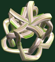 Keywords: mathematica 3d cg parametricplot3d texture torus code program algorithm tri-torus tritorus プログラム コード アルゴリズム 輪環 りんかん ドーナツ どーなつ 三芒星 さんぼうせい geometric sculpture geometricsculpture shape geometry sculpture mapping テクスチャ マッピング 模様 もよう abstract 抽象 ちゅうしょう アブストラクト design pattern デザイン パターン graphic グラフィック グラフィクス structure 意匠 構造 symmetry 対称性 たいしょうせい シンメトリー 対称 たいしょう black background photo border a = 6; (* center hole size *) b = 3; (* tri-torus *) c = 3; (* distance from the center of rotation *) d = 5; (* number of torus *) h = 2; (* height of a torus *) SetOptions[ParametricPlot3D, PlotRange -> Full, Mesh -> None, Boxed -> False, Axes -> False, PlotPoints -> 300, ImageSize -> 2600, Background -> RGBColor[{20, 50, 30}/255], PlotStyle -> Directive[Specularity[White, 70], Texture[Import["D:/tmp/862.jpg"]]], TextureCoordinateFunction -> ({#4 + #5, #5 / Pi} &), Lighting -> "Neutral"]; f[v_] := TriangleWave[{-1, 1}, v/(2 Pi)]; g[v_] := TriangleWave[{-1, 1}, v/(2 Pi) + 1/4]; x = (a - g[t] - f[b s]) g[s] + c; y = (a - g[t] - f[b s]) f[s] + c; z = (a - Sin[t] - h Sin[b s]); rm = Table[{x, y, z}.RotationMatrix[2 i Pi/d, {1, 1, 1}], {i, d}]; ParametricPlot3D[rm, {t, 0, 2 Pi}, {s, 0, 2 Pi}] (*--- The Texture *) a = 6; (* center hole size *) b = 3; (* tri-torus *) c = 3; (* distance from the center of rotation *) d = 5; (* number of torus *) h = 2; (* height of a torus *) SetOptions[ParametricPlot3D, PlotRange -> Full, Mesh -> None, Boxed -> False, Axes -> False, PlotPoints -> 300, ImageSize -> 2600, Background -> RGBColor[{20, 50, 30}/255], PlotStyle -> Directive[Specularity[White, 70], Texture[Import["D:/tmp/862.jpg"]]], TextureCoordinateFunction -> ({#4 + #5, #5 / Pi} &), Lighting -> "Neutral"]; f[v_] := TriangleWave[{-1, 1}, v/(2 Pi)]; g[v_] := TriangleWave[{-1, 1}, v/(2 Pi) + 1/4]; x = (a - g[t] - f[b s]) g[s] + c; y = (a - g[t] - f[b s]) f[s] + c; z = (a - Sin[t] - h Sin[b s]); rm = Table[{x, y, z}.RotationMatrix[2 i Pi/d, {1, 1, 1}], {i, d}]; ParametricPlot3D[rm, {t, 0, 2 Pi}, {s, 0, 2 Pi}] (*--- The Texture *) |