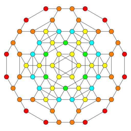 Keywords: 5-demicube t123 D4.svg en 5-demicube family polytopes in D4 en Coxeter plane symmetry own 11/20/10 User Tomruen Set of colored Coxeter plane graphs red orange yellow green vertices