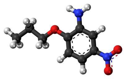 Keywords: 5-Nitro-2-propoxyaniline-3D-balls.png Ball-and-stick model of the 5-nitro-2-propoxyaniline molecule one of the strongest sweet-tasting substances known once used as an artificial sweetener Colour code 505050 Carbon C black<br> F0F0F0 Hydrogen H white<br> F51E1E Oxygen O red<br> 3C50FA Nitrogen N blue<br> 2011-05-28 own DS Visualizer Jynto talk Space-filling version cc-zero Nitroanilines Phenol ethers Propoxybenzenes Artificial sweeteners Images by Jynto Ball-and-stick models |