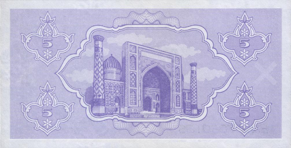 | Keywords: 5 som. Uzbekistan, 1992 b.jpg 5 сум Узбекистана 1992 5 sum of Uzbekistan 1992 own scan 1992 Central Bank of the Republic of Uzbekistan Цент альный банк Республики Узбекистан Ўзбекистон Республикаси а казий банки PD-UZ-exempt banknotes Banknotes of Uzbekistan 1992 Banknotes with Sherdor madrasah drawings Banknotes with a face value of 5 Purple banknotes |