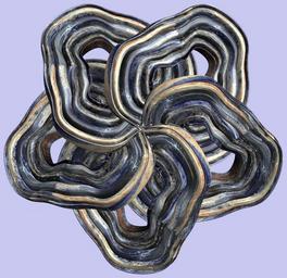 Keywords: mathematica 3d cg parametricplot3d texture torus code program algorithm プログラム コード アルゴリズム 輪環 りんかん ドーナツ どーなつ トーラス とーらす mapping テクスチャ マッピング 模様 もよう abstract 抽象 ちゅうしょう アブストラクト design pattern デザイン パターン graphic グラフィック グラフィクス structure 意匠 構造 symmetry 対称性 たいしょうせい シンメトリー 対称 たいしょう drawing architecture door ancient surreal a = 7; (* center hole size of a torus *) b1 = 3;(* the number of angles *) b2 = 6;(* the number of waves *) c = 6; (* distance from the center of rotation *) d = 5; (* the number of tori *) h1 = 3; (* width of a torus *) h2 = 1; (* width of a torus *) SetOptions[ParametricPlot3D, PlotRange -> Full, Mesh -> None, Boxed -> False, Axes -> None, PlotPoints -> 500, ImageSize -> 3000, Background -> RGBColor[{200, 200, 240}/255], PlotStyle -> Directive[Specularity[White, 70], Texture[Import["D:/tmp/94.jpg"]]], TextureCoordinateFunction -> ({#4, #5 Pi} &), Lighting -> "Neutral"]; f[v_] := Sin[2 Sin[Sin[Sin[v]]]]; x = (a - h1 Cos[t] + h2 f[b1 s]) Cos[s] + c; y = (a - h1 Cos[t] + h2 f[b1 s]) Sin[s] + c; z = f[b2 t]; rm = Table[{x, y, z}.RotationMatrix[2 i Pi/d, {0, 1, 2}], {i, d}]; ParametricPlot3D[rm, {t, 0, 2 Pi}, {s, 0, 2 Pi}] (*--- The Texture *) a = 7; (* center hole size of a torus *) b1 = 3;(* the number of angles *) b2 = 6;(* the number of waves *) c = 6; (* distance from the center of rotation *) d = 5; (* the number of tori *) h1 = 3; (* width of a torus *) h2 = 1; (* width of a torus *) SetOptions[ParametricPlot3D, PlotRange -> Full, Mesh -> None, Boxed -> False, Axes -> None, PlotPoints -> 500, ImageSize -> 3000, Background -> RGBColor[{200, 200, 240}/255], PlotStyle -> Directive[Specularity[White, 70], Texture[Import["D:/tmp/94.jpg"]]], TextureCoordinateFunction -> ({#4, #5 Pi} &), Lighting -> "Neutral"]; f[v_] := Sin[2 Sin[Sin[Sin[v]]]]; x = (a - h1 Cos[t] + h2 f[b1 s]) Cos[s] + c; y = (a - h1 Cos[t] + h2 f[b1 s]) Sin[s] + c; z = f[b2 t]; rm = Table[{x, y, z}.RotationMatrix[2 i Pi/d, {0, 1, 2}], {i, d}]; ParametricPlot3D[rm, {t, 0, 2 Pi}, {s, 0, 2 Pi}] (*--- The Texture *) |