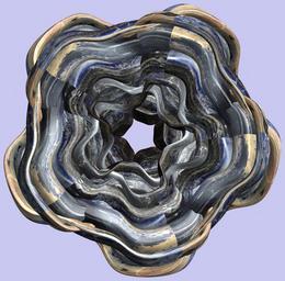 Keywords: mathematica 3d cg parametricplot3d texture torus code program algorithm プログラム コード アルゴリズム 輪環 りんかん ドーナツ どーなつ トーラス とーらす mapping テクスチャ マッピング 模様 もよう abstract 抽象 ちゅうしょう アブストラクト design pattern デザイン パターン graphic グラフィック グラフィクス structure 意匠 構造 symmetry 対称性 たいしょうせい シンメトリー 対称 たいしょう drawing surreal painting door white background architecture a = 7; (* center hole size of a torus *) b1 = 4;(* the number of angles *) b2 = 4;(* the number of waves *) c = 1; (* distance from the center of rotation *) d = 5; (* the number of tori *) h1 = 3; (* width of a torus *) h2 = 1; (* width of a torus *) SetOptions[ParametricPlot3D, PlotRange -> Full, Mesh -> None, Boxed -> False, Axes -> None, PlotPoints -> 500, ImageSize -> 3000, Background -> RGBColor[{200, 200, 240}/255], PlotStyle -> Directive[Specularity[White, 70], Texture[Import["D:/tmp/94.jpg"]]], TextureCoordinateFunction -> ({#4, #5 Pi} &), Lighting -> "Neutral"]; f[v_] := Sin[2 Sin[Sin[Sin[v]]]]; x = (a - h1 Cos[t] + h2 f[b1 s]) Cos[s] + c; y = (a - h1 Cos[t] + h2 f[b1 s]) Sin[s] + c; z = f[b2 t]; rm = Table[{x, y, z}.RotationMatrix[2 i Pi/d, {0, 1, 2}], {i, d}]; ParametricPlot3D[rm, {t, 0, 2 Pi}, {s, 0, 2 Pi}] (*--- The Texture *) a = 7; (* center hole size of a torus *) b1 = 4;(* the number of angles *) b2 = 4;(* the number of waves *) c = 1; (* distance from the center of rotation *) d = 5; (* the number of tori *) h1 = 3; (* width of a torus *) h2 = 1; (* width of a torus *) SetOptions[ParametricPlot3D, PlotRange -> Full, Mesh -> None, Boxed -> False, Axes -> None, PlotPoints -> 500, ImageSize -> 3000, Background -> RGBColor[{200, 200, 240}/255], PlotStyle -> Directive[Specularity[White, 70], Texture[Import["D:/tmp/94.jpg"]]], TextureCoordinateFunction -> ({#4, #5 Pi} &), Lighting -> "Neutral"]; f[v_] := Sin[2 Sin[Sin[Sin[v]]]]; x = (a - h1 Cos[t] + h2 f[b1 s]) Cos[s] + c; y = (a - h1 Cos[t] + h2 f[b1 s]) Sin[s] + c; z = f[b2 t]; rm = Table[{x, y, z}.RotationMatrix[2 i Pi/d, {0, 1, 2}], {i, d}]; ParametricPlot3D[rm, {t, 0, 2 Pi}, {s, 0, 2 Pi}] (*--- The Texture *) |