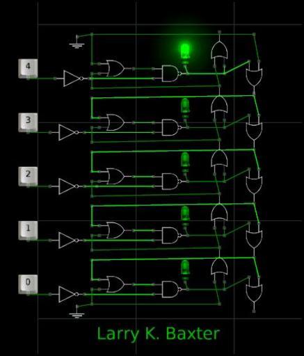 Keywords: Снимок модели 5B триггера Larry K. Baxter.JPG Снимок модели 5-ти битного т игге а Larry K Baxter'а из US Patent 3 764 919 Oct 9 1973 Filed Dec 22 1972 Fig 3 2010-06-17 own assumed Анд ей Куликов Flip-flops