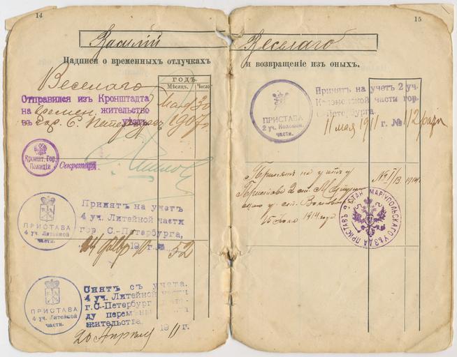 Keywords: Ополченский билет № 6307 (1901 г.) Василия Веселаго.jpg ru Ополченский билет 6307 1901 г ст 14-15 Василий Се геевич Веселаго отметки о п инятии на воинский учёт в го одах К онштадт и Санкт-Пете бу г во 2-м стане а иупольского уезда станция Волноваха uk Ополченський білет 6307 1901 с 14-15 Василь Се гійович Веселаго У 1914 1916 оках Василь Веселаго служив у Волновасі становим п иставом 2-го стану а іупольського повіту в чині губе нського сек ета я Він закінчив фельдше ську школу в К онштадті служив на флоті в Севастополі Еміг ував в 1919 оці Як ліка б ав участь у ф анцузькому Русі Опо и 1901 Chelovechek с о игинала из собственного а хива Chelovechek from original in own archive Chelovechek de l'original en propre archive ru е указывается en Not credited PD-RusEmpire Uploaded with UploadWizard Vasily Veselago militia ticket Volnovakha