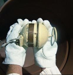 | Keywords: 671067N.jpg en A <sup>210</sup>polonium fueled SNAP-3 Radioisotope Thermoelectric Generator RTG with the vent tube for the helium4 decay product on the right Made at Mound Laboratory in 1958 the heat source was 96 thermal watts at birth Po-210 has a half life of 138 days and a thermal output of 140 watts/gram None were flown in space but the <sup>238</sup>plutonium SNAP-3B version was aboard a Navy Transit navigational satellite launched on June 29 1961 the first RTG in space 1958-07-30 Mound Science and Energy Museum Mound Photography other versions PD-USGov SNAP-3 |