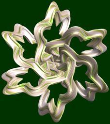 | Keywords: parametricplot3d mathematica cg 3d texture torus square wave squarewave 輪環 りんかん ドーナツ どーなつ 六芒星 ろくぼうせい 六光星 ろくこうせい 六稜星 ろくりょうせい program プログラム code コード algorithm コード アルゴリズム hexagram geometric sculpture geometricsculpture shape geometry sculpture mapping テクスチャ マッピング 模様 もよう design pattern デザイン パターン graphic グラフィック グラフィクス structure 意匠 構造 symmetry 対称性 たいしょうせい シンメトリー 対称 たいしょう algorithm organic pattern black background outdoor SetOptions[ParametricPlot3D, PlotRange -> Full, Mesh -> None, Boxed -> False, Axes -> None, PlotPoints -> 400, ImageSize -> 3000, Background -> Darker[Green, 0.8], PlotStyle -> Directive[Specularity[White, 30], Texture[Import["D:/tmp/862.jpg"]]], TextureCoordinateFunction -> ({#4 + #5, #5/Pi} &), Lighting -> "Neutral"]; a = 5; (* center hole size of a torus *) b = 6; (* hexa-torus *) c = 5; (* distance from the center of rotation *) d = 6; (* number of torus *) g[v_] := Sum[Cos[(2 k - 1) v]/(2 k - 1), {k, 4}]; x = (a - g[t] - Sin[b s]) Cos[s + Pi/(2 b)] + c; y = Sin[t] + c; z = (a - g[t] - Sin[b s]) Sin[s + Pi/(2 b)] + c; rot = Table[{x, y, z}.RotationMatrix[2 i Pi/d, {5, 3, 0}], {i, d}]; ParametricPlot3D[rot, {t, 0, 2 Pi}, {s, 0, 2 Pi}] (*--- The Texture is another color version of this: www.flickr.com/photos/tanaka_juuyoh/5412528282 The g[] is a 4-partial sum of the Fourier series for Square wave. g[]は矩形波のフーリエ展開の最初の4項 *) SetOptions[ParametricPlot3D, PlotRange -> Full, Mesh -> None, Boxed -> False, Axes -> None, PlotPoints -> 400, ImageSize -> 3000, Background -> Darker[Green, 0.8], PlotStyle -> Directive[Specularity[White, 30], Texture[Import["D:/tmp/862.jpg"]]], TextureCoordinateFunction -> ({#4 + #5, #5/Pi} &), Lighting -> "Neutral"]; a = 5; (* center hole size of a torus *) b = 6; (* hexa-torus *) c = 5; (* distance from the center of rotation *) d = 6; (* number of torus *) g[v_] := Sum[Cos[(2 k - 1) v]/(2 k - 1), {k, 4}]; x = (a - g[t] - Sin[b s]) Cos[s + Pi/(2 b)] + c; y = Sin[t] + c; z = (a - g[t] - Sin[b s]) Sin[s + Pi/(2 b)] + c; rot = Table[{x, y, z}.RotationMatrix[2 i Pi/d, {5, 3, 0}], {i, d}]; ParametricPlot3D[rot, {t, 0, 2 Pi}, {s, 0, 2 Pi}] (*--- The Texture is another color version of this: www.flickr.com/photos/tanaka_juuyoh/5412528282 The g[] is a 4-partial sum of the Fourier series for Square wave. g[]は矩形波のフーリエ展開の最初の4項 *) |