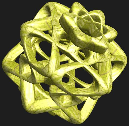 | Keywords: mathematica 3d cg parametricplot3d texture torus 輪環 りんかん ドーナツ どーなつ 六芒星 ろくぼうせい 六光星 ろくこうせい 六稜星 ろくりょうせい code program algorithm コード プログラム アルゴリズム hexagram geometric sculpture geometricsculpture shape geometry sculpture mapping テクスチャ マッピング 模様 もよう abstract 抽象 ちゅうしょう アブストラクト design pattern デザイン パターン graphic グラフィック グラフィクス structure 意匠 構造 symmetry 対称性 たいしょうせい シンメトリー 対称 たいしょう algorithm コード black background indoor plant foliage organic pattern ancient a = 8; (* center hole size of a torus *) b = 6; (* hexa-torus *) c = -7; (* distance from the center of rotation *) d = 6; (* number of torus *) h = 3; (* height of a torus *) SetOptions[ParametricPlot3D, PlotRange -> Full, Mesh -> None, Boxed -> False, Axes -> False, PlotPoints -> 400, ImageSize -> 3000, Background -> RGBColor[{30, 30, 30}/255], PlotStyle -> Directive[Specularity[White, 30], Texture[Import["D:/tmp/71.jpg"]]], TextureCoordinateFunction -> ({#4, #5 b Pi} &), Lighting -> "Neutral"]; f[v_] := Sin[2 Sin[Sin[Sin[v]]]]; x = (a - Cos[t] - Sin[b s]) Cos[s + Pi/(2 b)]; y = (a - Cos[t] - Sin[b s]) Sin[s + Pi/(2 b)]; z = (a - f[t] - h Sin[b s]) + c; rm = Table[{x, y, z}.RotationMatrix[2 i Pi/d, {1, 0, 0}], {i, d}]; ParametricPlot3D[rm, {t, 0, 2 Pi}, {s, 0, 2 Pi}] (*--- The Texture *) a = 8; (* center hole size of a torus *) b = 6; (* hexa-torus *) c = -7; (* distance from the center of rotation *) d = 6; (* number of torus *) h = 3; (* height of a torus *) SetOptions[ParametricPlot3D, PlotRange -> Full, Mesh -> None, Boxed -> False, Axes -> False, PlotPoints -> 400, ImageSize -> 3000, Background -> RGBColor[{30, 30, 30}/255], PlotStyle -> Directive[Specularity[White, 30], Texture[Import["D:/tmp/71.jpg"]]], TextureCoordinateFunction -> ({#4, #5 b Pi} &), Lighting -> "Neutral"]; f[v_] := Sin[2 Sin[Sin[Sin[v]]]]; x = (a - Cos[t] - Sin[b s]) Cos[s + Pi/(2 b)]; y = (a - Cos[t] - Sin[b s]) Sin[s + Pi/(2 b)]; z = (a - f[t] - h Sin[b s]) + c; rm = Table[{x, y, z}.RotationMatrix[2 i Pi/d, {1, 0, 0}], {i, d}]; ParametricPlot3D[rm, {t, 0, 2 Pi}, {s, 0, 2 Pi}] (*--- The Texture *) |