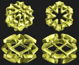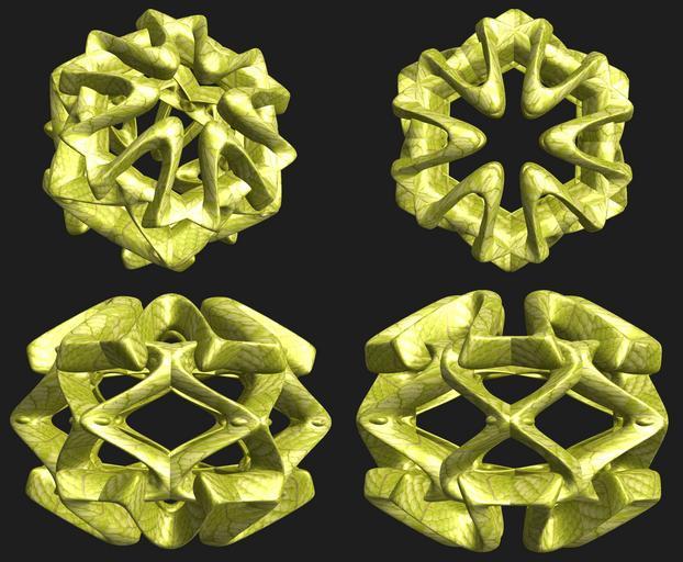 | Keywords: mathematica 3d cg parametricplot3d texture torus 輪環 りんかん ドーナツ どーなつ 六芒星 ろくぼうせい 六光星 ろくこうせい 六稜星 ろくりょうせい code program algorithm コード プログラム アルゴリズム hexagram geometric sculpture geometricsculpture shape geometry sculpture mapping テクスチャ マッピング 模様 もよう abstract 抽象 ちゅうしょう アブストラクト design pattern デザイン パターン graphic グラフィック グラフィクス structure 意匠 構造 symmetry 対称性 たいしょうせい シンメトリー 対称 たいしょう algorithm コード indoor black background foliage plant a = 5; (* center hole size of a torus *) b = 6; (* hexa-torus *) c = -10; (* distance from the center of rotation *) d = 6; (* number of torus *) h = 2; (* height of a torus *) SetOptions[ParametricPlot3D, PlotRange -> Full, Mesh -> None,    Boxed -> False, Axes -> False, PlotPoints -> 400, ImageSize -> 1600,    Background -> RGBColor[{30, 30, 30}/255],    PlotStyle -> Directive[Specularity[White, 30], Texture[Import["D:/tmp/71.jpg"]]],   TextureCoordinateFunction -> ({#4, #5 b Pi} &), Lighting -> "Neutral"];  f[v_] := Sin[2 Sin[Sin[Sin[v]]]]; x = (a - Cos[t] - Sin[b s]) Cos[s + Pi/(2 b)]; y = (a - Cos[t] - Sin[b s]) Sin[s + Pi/(2 b)]; z = (a - f[t] - h Sin[b s]) + c; rm = Table[{x, y, z}.RotationMatrix[2 i Pi/d, {1, 0, 0}], {i, d}];  ParametricPlot3D[rm, {t, 0, 2 Pi}, {s, 0, 2 Pi}]  (*---  The Texture *)   a = 5; (* center hole size of a torus *) b = 6; (* hexa-torus *) c = -10; (* distance from the center of rotation *) d = 6; (* number of torus *) h = 2; (* height of a torus *) SetOptions[ParametricPlot3D, PlotRange -> Full, Mesh -> None,    Boxed -> False, Axes -> False, PlotPoints -> 400, ImageSize -> 1600,    Background -> RGBColor[{30, 30, 30}/255],    PlotStyle -> Directive[Specularity[White, 30], Texture[Import["D:/tmp/71.jpg"]]],   TextureCoordinateFunction -> ({#4, #5 b Pi} &), Lighting -> "Neutral"];  f[v_] := Sin[2 Sin[Sin[Sin[v]]]]; x = (a - Cos[t] - Sin[b s]) Cos[s + Pi/(2 b)]; y = (a - Cos[t] - Sin[b s]) Sin[s + Pi/(2 b)]; z = (a - f[t] - h Sin[b s]) + c; rm = Table[{x, y, z}.RotationMatrix[2 i Pi/d, {1, 0, 0}], {i, d}];  ParametricPlot3D[rm, {t, 0, 2 Pi}, {s, 0, 2 Pi}]  (*---  The Texture *) |