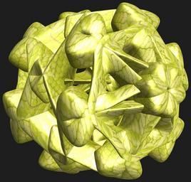 | Keywords: mathematica 3d cg parametricplot3d texture torus 輪環 りんかん ドーナツ どーなつ 六芒星 ろくぼうせい 六光星 ろくこうせい 六稜星 ろくりょうせい code program algorithm コード プログラム アルゴリズム hexagram geometric sculpture geometricsculpture shape geometry sculpture mapping テクスチャ マッピング 模様 もよう abstract 抽象 ちゅうしょう アブストラクト design pattern デザイン パターン graphic グラフィック グラフィクス structure 意匠 構造 symmetry 対称性 たいしょうせい シンメトリー 対称 たいしょう algorithm コード black background indoor a = 5; (* center hole size of a torus *) b = 6; (* hexa-torus *) c = -6; (* distance from the center of rotation *) d = 6; (* number of torus *) h = 2; (* height of a torus *) SetOptions[ParametricPlot3D, PlotRange -> Full, Mesh -> None, Boxed -> False, Axes -> False, PlotPoints -> 400, ImageSize -> 1600, Background -> RGBColor[{30, 30, 30}/255], PlotStyle -> Directive[Specularity[White, 30], Texture[Import["D:/tmp/71.jpg"]]], TextureCoordinateFunction -> ({#4, #5 b Pi} &), Lighting -> "Neutral"]; f[v_] := Sin[2 Sin[Sin[Sin[v]]]]; x = (a - Cos[t] - Sin[b s]) Cos[s + Pi/(2 b)]; y = (a - Cos[t] - Sin[b s]) Sin[s + Pi/(2 b)]; z = (a - f[t] - h Sin[b s]) + c; rm = Table[{x, y, z}.RotationMatrix[2 i Pi/d, {1, 0, 0}], {i, d}]; ParametricPlot3D[rm, {t, 0, 2 Pi}, {s, 0, 2 Pi}] (*--- The Texture *) a = 5; (* center hole size of a torus *) b = 6; (* hexa-torus *) c = -6; (* distance from the center of rotation *) d = 6; (* number of torus *) h = 2; (* height of a torus *) SetOptions[ParametricPlot3D, PlotRange -> Full, Mesh -> None, Boxed -> False, Axes -> False, PlotPoints -> 400, ImageSize -> 1600, Background -> RGBColor[{30, 30, 30}/255], PlotStyle -> Directive[Specularity[White, 30], Texture[Import["D:/tmp/71.jpg"]]], TextureCoordinateFunction -> ({#4, #5 b Pi} &), Lighting -> "Neutral"]; f[v_] := Sin[2 Sin[Sin[Sin[v]]]]; x = (a - Cos[t] - Sin[b s]) Cos[s + Pi/(2 b)]; y = (a - Cos[t] - Sin[b s]) Sin[s + Pi/(2 b)]; z = (a - f[t] - h Sin[b s]) + c; rm = Table[{x, y, z}.RotationMatrix[2 i Pi/d, {1, 0, 0}], {i, d}]; ParametricPlot3D[rm, {t, 0, 2 Pi}, {s, 0, 2 Pi}] (*--- The Texture *) |