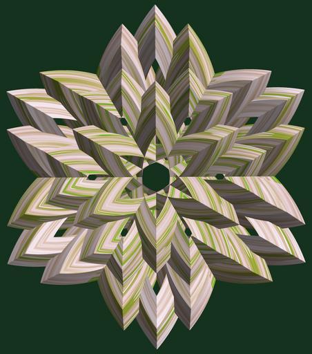 | Keywords: mathematica 3d cg parametricplot3d texture torus code program algorithm プログラム コード アルゴリズム 輪環 りんかん ドーナツ どーなつ 六芒星 ろくぼうせい geometric sculpture geometricsculpture shape geometry sculpture mapping テクスチャ マッピング 模様 もよう abstract 抽象 ちゅうしょう アブストラクト design pattern デザイン パターン graphic グラフィック グラフィクス structure 意匠 構造 symmetry 対称性 たいしょうせい シンメトリー 対称 たいしょう outdoor pastel a = 3; (* center hole size *) b = 6; (* hexa-torus *) c = 1; (* distance from the center of rotation *) d = 6; (* number of torus *) h = 2; (* height of a torus *) SetOptions[ParametricPlot3D, PlotRange -> Full, Mesh -> None, Boxed -> False, Axes -> False, PlotPoints -> 400, ImageSize -> 3000, Background -> RGBColor[{20, 50, 30}/255], PlotStyle -> Directive[Specularity[White, 40], Texture[Import["D:/tmp/862.jpg"]]], TextureCoordinateFunction -> ({#4 + #5, #5 / Pi} &), Lighting -> "Neutral"]; f[v_] := TriangleWave[{-1, 1}, v/(2 Pi)]; g[v_] := TriangleWave[{-1, 1}, v/(2 Pi) + 1/4]; x = (a - g[t] - f[b s]) Cos[s] + c; y = (a - g[t] - f[b s]) Sin[s] + c; z = (a - f[t] - h f[b s]); rm = Table[{x, y, z}.RotationMatrix[2 i Pi/d, {0, 0, 1}], {i, d}]; ParametricPlot3D[rm, {t, 0, 2 Pi}, {s, 0, Pi}] (*--- The Texture *) a = 3; (* center hole size *) b = 6; (* hexa-torus *) c = 1; (* distance from the center of rotation *) d = 6; (* number of torus *) h = 2; (* height of a torus *) SetOptions[ParametricPlot3D, PlotRange -> Full, Mesh -> None, Boxed -> False, Axes -> False, PlotPoints -> 400, ImageSize -> 3000, Background -> RGBColor[{20, 50, 30}/255], PlotStyle -> Directive[Specularity[White, 40], Texture[Import["D:/tmp/862.jpg"]]], TextureCoordinateFunction -> ({#4 + #5, #5 / Pi} &), Lighting -> "Neutral"]; f[v_] := TriangleWave[{-1, 1}, v/(2 Pi)]; g[v_] := TriangleWave[{-1, 1}, v/(2 Pi) + 1/4]; x = (a - g[t] - f[b s]) Cos[s] + c; y = (a - g[t] - f[b s]) Sin[s] + c; z = (a - f[t] - h f[b s]); rm = Table[{x, y, z}.RotationMatrix[2 i Pi/d, {0, 0, 1}], {i, d}]; ParametricPlot3D[rm, {t, 0, 2 Pi}, {s, 0, Pi}] (*--- The Texture *) |