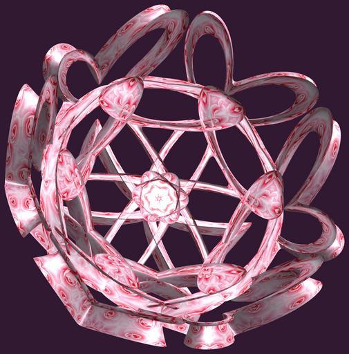 Keywords: mathematica 3d cg parametricplot3d texture torus 輪環 りんかん ドーナツ どーなつ 五芒星 ごぼうせい 五光星 ごこうせい 五稜星 ごりょうせい code program algorithm コード プログラム アルゴリズム pentagram geometric sculpture geometricsculpture shape geometry sculpture mapping テクスチャ マッピング 模様 もよう abstract 抽象 ちゅうしょう アブストラクト design pattern デザイン パターン graphic グラフィック グラフィクス structure 意匠 構造 symmetry 対称性 たいしょうせい シンメトリー 対称 たいしょう algorithm コード black background tangle wheel surreal a = 2; (* center hole size of a torus *) b = 5; (* penta-torus *) c = 3; (* distance from the center of rotation *) d = 6; (* number of torus *) h = 1; (* height of a torus *) SetOptions[ParametricPlot3D, PlotRange -> Full, Mesh -> None, Boxed -> False, Axes -> False, PlotPoints -> 400, ImageSize -> 3000, Background -> RGBColor[{50, 25, 50}/255], PlotStyle -> Directive[Specularity[White, 30], Texture[Import["D:/tmp/86.jpg"]]], TextureCoordinateFunction -> ({#4, #5 2 Pi} &), Lighting -> "Neutral"]; f[v_] := Cos[2 Cos[Cos[Cos[v]]]]; x = (a - f[t] - Sin[b s]) Cos[s + 3 Pi/(4 b)] + c; y = (a - f[t] - Sin[b s]) Sin[s + 3 Pi/(4 b)] + c; z = (a - Sin[t/2] - h Sin[b s]); rot = Table[{x, y, z}.RotationMatrix[2 i Pi/d, {1, 1, 2}], {i, d}]; ParametricPlot3D[rot, {t, 0, 2 Pi}, {s, 0, 2 Pi}] (*--- The Texture *) a = 2; (* center hole size of a torus *) b = 5; (* penta-torus *) c = 3; (* distance from the center of rotation *) d = 6; (* number of torus *) h = 1; (* height of a torus *) SetOptions[ParametricPlot3D, PlotRange -> Full, Mesh -> None, Boxed -> False, Axes -> False, PlotPoints -> 400, ImageSize -> 3000, Background -> RGBColor[{50, 25, 50}/255], PlotStyle -> Directive[Specularity[White, 30], Texture[Import["D:/tmp/86.jpg"]]], TextureCoordinateFunction -> ({#4, #5 2 Pi} &), Lighting -> "Neutral"]; f[v_] := Cos[2 Cos[Cos[Cos[v]]]]; x = (a - f[t] - Sin[b s]) Cos[s + 3 Pi/(4 b)] + c; y = (a - f[t] - Sin[b s]) Sin[s + 3 Pi/(4 b)] + c; z = (a - Sin[t/2] - h Sin[b s]); rot = Table[{x, y, z}.RotationMatrix[2 i Pi/d, {1, 1, 2}], {i, d}]; ParametricPlot3D[rot, {t, 0, 2 Pi}, {s, 0, 2 Pi}] (*--- The Texture *) |