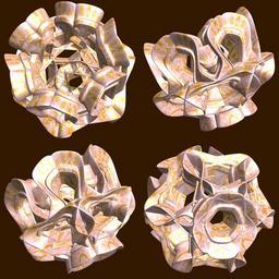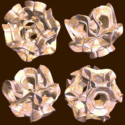 Keywords: mathematica 3d cg parametricplot3d texture torus 輪環 りんかん ドーナツ どーなつ 五芒星 ごぼうせい 五光星 ごこうせい 五稜星 ごりょうせい code program algorithm コード プログラム アルゴリズム pentagram geometric sculpture geometricsculpture shape geometry sculpture mapping テクスチャ マッピング 模様 もよう abstract 抽象 ちゅうしょう アブストラクト design pattern デザイン パターン graphic グラフィック グラフィクス structure 意匠 構造 symmetry 対称性 たいしょうせい シンメトリー 対称 たいしょう algorithm コード black background indoor surreal photo border a = 4; (* center hole size of a torus *) b = 5; (* penta-torus *) c = 6; (* distance from the center of rotation *) d = 6; (* number of torus *) h = 1; (* height of a torus *) SetOptions[ParametricPlot3D, PlotRange -> Full, Mesh -> None, Boxed -> False, Axes -> False, PlotPoints -> 400, ImageSize -> 1600, Background -> Darker[Orange, 0.8], PlotStyle -> Directive[Specularity[White, 30], Texture[Import["D:/tmp/861.jpg"]]], TextureCoordinateFunction -> ({#4, #5 2 Pi} &), Lighting -> "Neutral"]; f[v_] := Sin[2 Sin[Sin[Sin[v]]]]; g[v_] := Sum[Cos[(2 k - 1) v]/(2 k - 1), {k, 4}]; x = (a - g[t] - f[b s]) Cos[s + 3 Pi/(4 b)] + c; y = (a - g[t] - f[b s]) Sin[s + 3 Pi/(4 b)] + c; z = (a - Sin[t] - h f[b s]); rot = Table[{x, y, z}.RotationMatrix[2 i Pi/d, {1, 1, 1}], {i, d}]; ParametricPlot3D[rot, {t, 0, 2 Pi}, {s, 0, 2 Pi}] (*--- The Texture *) a = 4; (* center hole size of a torus *) b = 5; (* penta-torus *) c = 6; (* distance from the center of rotation *) d = 6; (* number of torus *) h = 1; (* height of a torus *) SetOptions[ParametricPlot3D, PlotRange -> Full, Mesh -> None, Boxed -> False, Axes -> False, PlotPoints -> 400, ImageSize -> 1600, Background -> Darker[Orange, 0.8], PlotStyle -> Directive[Specularity[White, 30], Texture[Import["D:/tmp/861.jpg"]]], TextureCoordinateFunction -> ({#4, #5 2 Pi} &), Lighting -> "Neutral"]; f[v_] := Sin[2 Sin[Sin[Sin[v]]]]; g[v_] := Sum[Cos[(2 k - 1) v]/(2 k - 1), {k, 4}]; x = (a - g[t] - f[b s]) Cos[s + 3 Pi/(4 b)] + c; y = (a - g[t] - f[b s]) Sin[s + 3 Pi/(4 b)] + c; z = (a - Sin[t] - h f[b s]); rot = Table[{x, y, z}.RotationMatrix[2 i Pi/d, {1, 1, 1}], {i, d}]; ParametricPlot3D[rot, {t, 0, 2 Pi}, {s, 0, 2 Pi}] (*--- The Texture *) |