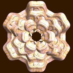 Keywords: mathematica 3d cg parametricplot3d texture torus 輪環 りんかん ドーナツ どーなつ 五芒星 ごぼうせい 五光星 ごこうせい 五稜星 ごりょうせい code program algorithm コード プログラム アルゴリズム pentagram geometric sculpture geometricsculpture shape geometry sculpture mapping テクスチャ マッピング 模様 もよう abstract 抽象 ちゅうしょう アブストラクト design pattern デザイン パターン graphic グラフィック グラフィクス structure 意匠 構造 symmetry 対称性 たいしょうせい シンメトリー 対称 たいしょう algorithm コード indoor black background a = 6; (* center hole size of a torus *) b = 5; (* penta-torus *) c = 2; (* distance from the center of rotation *) d = 6; (* number of torus *) h = 1; (* height of a torus *) SetOptions[ParametricPlot3D, PlotRange -> Full, Mesh -> None, Boxed -> False, Axes -> False, PlotPoints -> 400, ImageSize -> 3000, Background -> Darker[Orange, 0.8], PlotStyle -> Directive[Specularity[White, 30], Texture[Import["D:/tmp/861.jpg"]]], TextureCoordinateFunction -> ({#4, #5 2 Pi} &), Lighting -> "Neutral"]; f[v_] := Sin[2 Sin[Sin[Sin[v]]]]; g[v_] := Sum[Cos[(2 k - 1) v]/(2 k - 1), {k, 4}]; x = (a - g[t] - f[b s]) Cos[s + 3 Pi/(4 b)] + c; y = (a - g[t] - f[b s]) Sin[s + 3 Pi/(4 b)] + c; z = (a - Sin[t] - h f[b s]); rot = Table[{x, y, z}.RotationMatrix[2 i Pi/d, {0, 0, 1}], {i, d}]; ParametricPlot3D[rot, {t, 0, 2 Pi}, {s, 0, 2 Pi}] (*--- The Texture *) a = 6; (* center hole size of a torus *) b = 5; (* penta-torus *) c = 2; (* distance from the center of rotation *) d = 6; (* number of torus *) h = 1; (* height of a torus *) SetOptions[ParametricPlot3D, PlotRange -> Full, Mesh -> None, Boxed -> False, Axes -> False, PlotPoints -> 400, ImageSize -> 3000, Background -> Darker[Orange, 0.8], PlotStyle -> Directive[Specularity[White, 30], Texture[Import["D:/tmp/861.jpg"]]], TextureCoordinateFunction -> ({#4, #5 2 Pi} &), Lighting -> "Neutral"]; f[v_] := Sin[2 Sin[Sin[Sin[v]]]]; g[v_] := Sum[Cos[(2 k - 1) v]/(2 k - 1), {k, 4}]; x = (a - g[t] - f[b s]) Cos[s + 3 Pi/(4 b)] + c; y = (a - g[t] - f[b s]) Sin[s + 3 Pi/(4 b)] + c; z = (a - Sin[t] - h f[b s]); rot = Table[{x, y, z}.RotationMatrix[2 i Pi/d, {0, 0, 1}], {i, d}]; ParametricPlot3D[rot, {t, 0, 2 Pi}, {s, 0, 2 Pi}] (*--- The Texture *) |