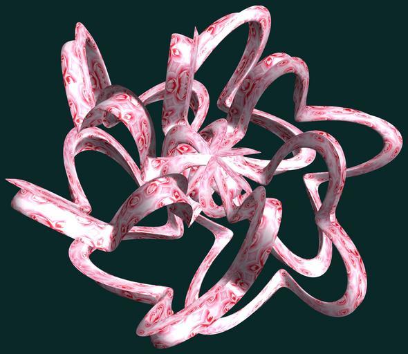 Keywords: mathematica 3d cg parametricplot3d texture torus 輪環 りんかん ドーナツ どーなつ 四芒星 しぼうせい 四光星 しこうせい 四稜星 しりょうせい code program algorithm コード プログラム アルゴリズム geometric sculpture geometricsculpture shape geometry sculpture mapping テクスチャ マッピング 模様 もよう abstract 抽象 ちゅうしょう アブストラクト design pattern デザイン パターン graphic グラフィック グラフィクス structure 意匠 構造 symmetry 対称性 たいしょうせい シンメトリー 対称 たいしょう algorithm コード black background blossom plant tangle a = 3; (* center hole size of a torus *) b = 4; (* tetra-torus *) c = 3; (* distance from the center of rotation *) d = 6; (* number of torus *) h = 1; (* height of a torus *) SetOptions[ParametricPlot3D, PlotRange -> Full, Mesh -> None, Boxed -> False, Axes -> False, PlotPoints -> 400, ImageSize -> 3000, Background -> RGBColor[{10, 40, 40}/255], PlotStyle -> Directive[Specularity[White, 30], Texture[Import["D:/tmp/86.jpg"]]], TextureCoordinateFunction -> ({#4, #5 2 Pi} &), Lighting -> "Neutral"]; f[v_] := Cos[2 Cos[Cos[Cos[v]]]]; x = (a - f[t] - Sin[b s]) Cos[s + Pi/(2 b)] + c; y = (a - f[t] - Sin[b s]) Sin[s + Pi/(2 b)] + c; z = (Sin[t/2] - h Sin[b s]) + c; rot = Table[{x, y, z}.RotationMatrix[2 i Pi/d, {0, 1, 1}], {i, d}]; ParametricPlot3D[rot, {t, 0, 2 Pi}, {s, 0, 2 Pi}] (*--- The Texture *) a = 3; (* center hole size of a torus *) b = 4; (* tetra-torus *) c = 3; (* distance from the center of rotation *) d = 6; (* number of torus *) h = 1; (* height of a torus *) SetOptions[ParametricPlot3D, PlotRange -> Full, Mesh -> None, Boxed -> False, Axes -> False, PlotPoints -> 400, ImageSize -> 3000, Background -> RGBColor[{10, 40, 40}/255], PlotStyle -> Directive[Specularity[White, 30], Texture[Import["D:/tmp/86.jpg"]]], TextureCoordinateFunction -> ({#4, #5 2 Pi} &), Lighting -> "Neutral"]; f[v_] := Cos[2 Cos[Cos[Cos[v]]]]; x = (a - f[t] - Sin[b s]) Cos[s + Pi/(2 b)] + c; y = (a - f[t] - Sin[b s]) Sin[s + Pi/(2 b)] + c; z = (Sin[t/2] - h Sin[b s]) + c; rot = Table[{x, y, z}.RotationMatrix[2 i Pi/d, {0, 1, 1}], {i, d}]; ParametricPlot3D[rot, {t, 0, 2 Pi}, {s, 0, 2 Pi}] (*--- The Texture *) |