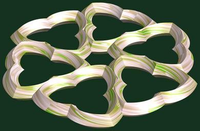 Keywords: mathematica 3d cg parametricplot3d texture torus code program algorithm tri-torus tritorus プログラム コード アルゴリズム 輪環 りんかん ドーナツ どーなつ 三芒星 さんぼうせい geometric sculpture geometricsculpture shape geometry sculpture mapping テクスチャ マッピング 模様 もよう abstract 抽象 ちゅうしょう アブストラクト design pattern デザイン パターン graphic グラフィック グラフィクス structure 意匠 構造 symmetry 対称性 たいしょうせい シンメトリー 対称 たいしょう black background a = 4; (* center hole size *) b = 3; (* tri-torus *) c = 5; (* distance from the center of rotation *) d = 6; (* number of torus *) h = 0; (* height of a torus *) SetOptions[ParametricPlot3D, PlotRange -> Full, Mesh -> None, Boxed -> False, Axes -> False, PlotPoints -> 400, ImageSize -> 3000, Background -> RGBColor[{20, 50, 30}/255], PlotStyle -> Directive[Specularity[White, 40], Texture[Import["D:/tmp/862.jpg"]]], TextureCoordinateFunction -> ({#4 + #5, #5 / Pi} &), Lighting -> "Neutral"]; f[v_] := TriangleWave[{-1, 1}, v/(2 Pi)]; g[v_] := TriangleWave[{-1, 1}, v/(2 Pi) + 1/4]; x = (a - g[t] - f[b s]) Cos[s] + c; y = (a - g[t] - f[b s]) Sin[s] + c; z = (a - f[t] - h f[b s]); rm = Table[{x, y, z}.RotationMatrix[2 i Pi/d, {0, 0, 1}], {i, d}]; ParametricPlot3D[rm, {t, 0, 2 Pi}, {s, 0, Pi}] (*--- The Texture *) a = 4; (* center hole size *) b = 3; (* tri-torus *) c = 5; (* distance from the center of rotation *) d = 6; (* number of torus *) h = 0; (* height of a torus *) SetOptions[ParametricPlot3D, PlotRange -> Full, Mesh -> None, Boxed -> False, Axes -> False, PlotPoints -> 400, ImageSize -> 3000, Background -> RGBColor[{20, 50, 30}/255], PlotStyle -> Directive[Specularity[White, 40], Texture[Import["D:/tmp/862.jpg"]]], TextureCoordinateFunction -> ({#4 + #5, #5 / Pi} &), Lighting -> "Neutral"]; f[v_] := TriangleWave[{-1, 1}, v/(2 Pi)]; g[v_] := TriangleWave[{-1, 1}, v/(2 Pi) + 1/4]; x = (a - g[t] - f[b s]) Cos[s] + c; y = (a - g[t] - f[b s]) Sin[s] + c; z = (a - f[t] - h f[b s]); rm = Table[{x, y, z}.RotationMatrix[2 i Pi/d, {0, 0, 1}], {i, d}]; ParametricPlot3D[rm, {t, 0, 2 Pi}, {s, 0, Pi}] (*--- The Texture *) |