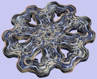 Keywords: mathematica 3d cg parametricplot3d texture torus code program algorithm プログラム コード アルゴリズム 輪環 りんかん ドーナツ どーなつ トーラス とーらす mapping テクスチャ マッピング 模様 もよう abstract 抽象 ちゅうしょう アブストラクト design pattern デザイン パターン graphic グラフィック グラフィクス structure 意匠 構造 symmetry 対称性 たいしょうせい シンメトリー 対称 たいしょう indoor white background surreal a = 7; (* center hole size of a torus *) b1 = 6;(* the number of angles *) b2 = 6;(* the number of waves *) c = 7; (* distance from the center of rotation *) d = 6; (* the number of tori *) h1 = 3; (* width of a torus *) h2 = 1; (* width of a torus *) SetOptions[ParametricPlot3D, PlotRange -> Full, Mesh -> None, Boxed -> False, Axes -> None, PlotPoints -> 500, ImageSize -> 3000, Background -> RGBColor[{200, 200, 240}/255], PlotStyle -> Directive[Specularity[White, 70], Texture[Import["D:/tmp/94.jpg"]]], TextureCoordinateFunction -> ({#4, #5 Pi} &), Lighting -> "Neutral"]; f[v_] := Sin[2 Sin[Sin[Sin[v]]]]; x = (a - h1 Cos[t] + h2 f[b1 s]) Cos[s] + c; y = (a - h1 Cos[t] + h2 f[b1 s]) Sin[s] + c; z = f[b2 t]; rm = Table[{x, y, z}.RotationMatrix[2 i Pi/d, {1, 0, 0}], {i, d}]; ParametricPlot3D[rm, {t, 0, 2 Pi}, {s, 0, 2 Pi}] (*--- The Texture *) a = 7; (* center hole size of a torus *) b1 = 6;(* the number of angles *) b2 = 6;(* the number of waves *) c = 7; (* distance from the center of rotation *) d = 6; (* the number of tori *) h1 = 3; (* width of a torus *) h2 = 1; (* width of a torus *) SetOptions[ParametricPlot3D, PlotRange -> Full, Mesh -> None, Boxed -> False, Axes -> None, PlotPoints -> 500, ImageSize -> 3000, Background -> RGBColor[{200, 200, 240}/255], PlotStyle -> Directive[Specularity[White, 70], Texture[Import["D:/tmp/94.jpg"]]], TextureCoordinateFunction -> ({#4, #5 Pi} &), Lighting -> "Neutral"]; f[v_] := Sin[2 Sin[Sin[Sin[v]]]]; x = (a - h1 Cos[t] + h2 f[b1 s]) Cos[s] + c; y = (a - h1 Cos[t] + h2 f[b1 s]) Sin[s] + c; z = f[b2 t]; rm = Table[{x, y, z}.RotationMatrix[2 i Pi/d, {1, 0, 0}], {i, d}]; ParametricPlot3D[rm, {t, 0, 2 Pi}, {s, 0, 2 Pi}] (*--- The Texture *) |